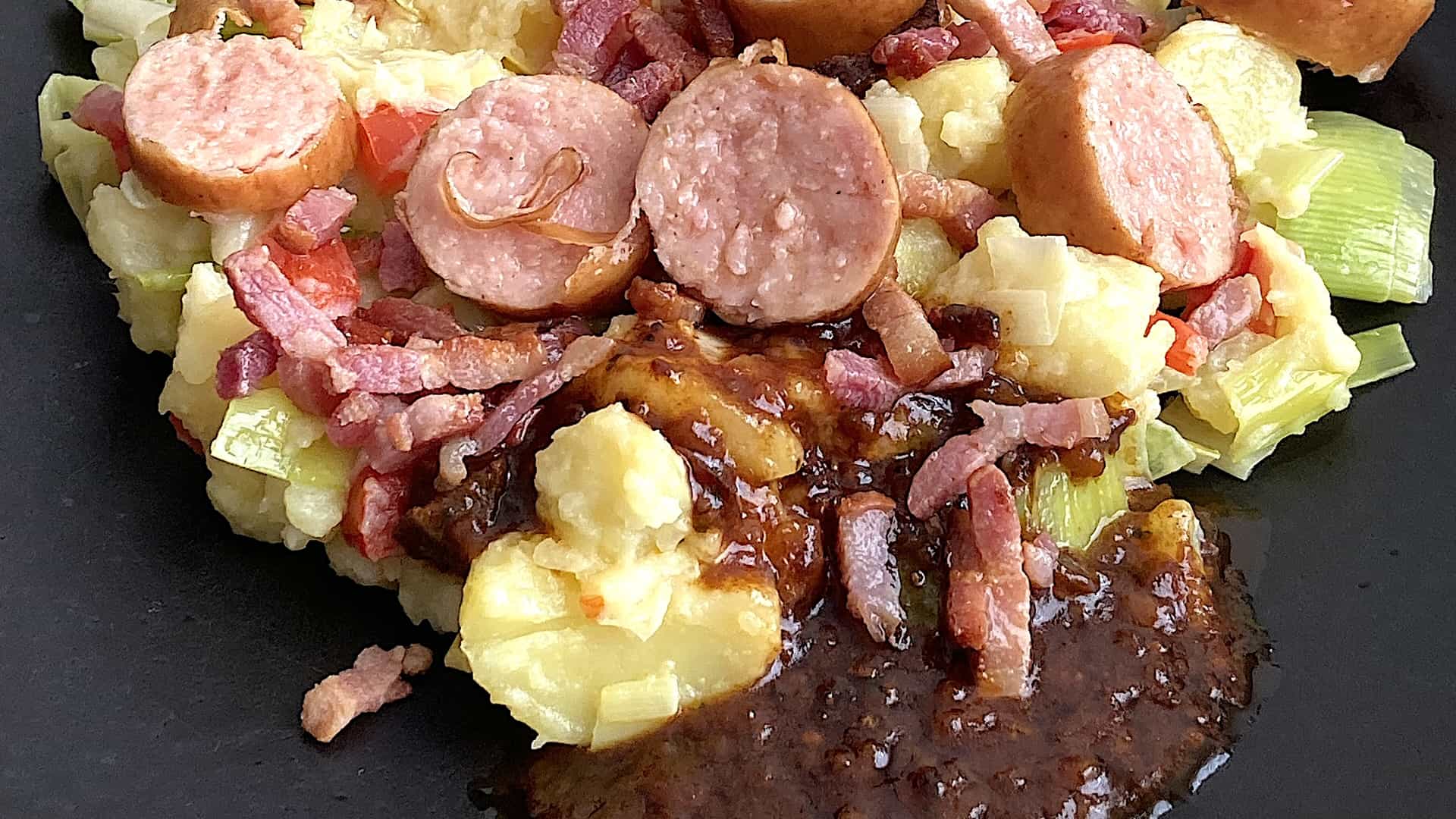Serveer de stamppot met de plakjes rookworst op een bord. Strooi er de hamreepjes over.