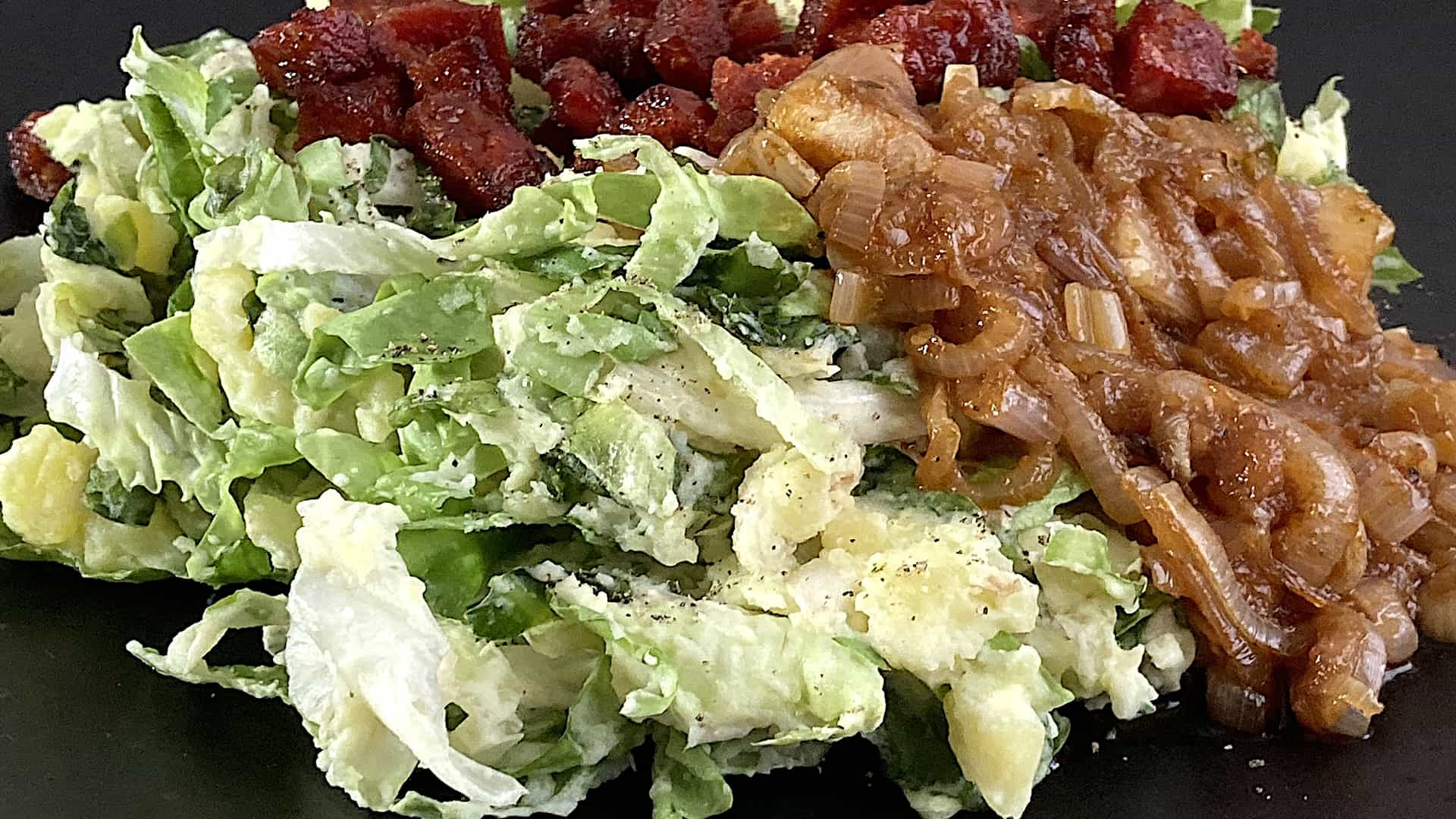 Serveer de andijviestamppot op een bord en strooi er de chorizo en uitjes overheen.