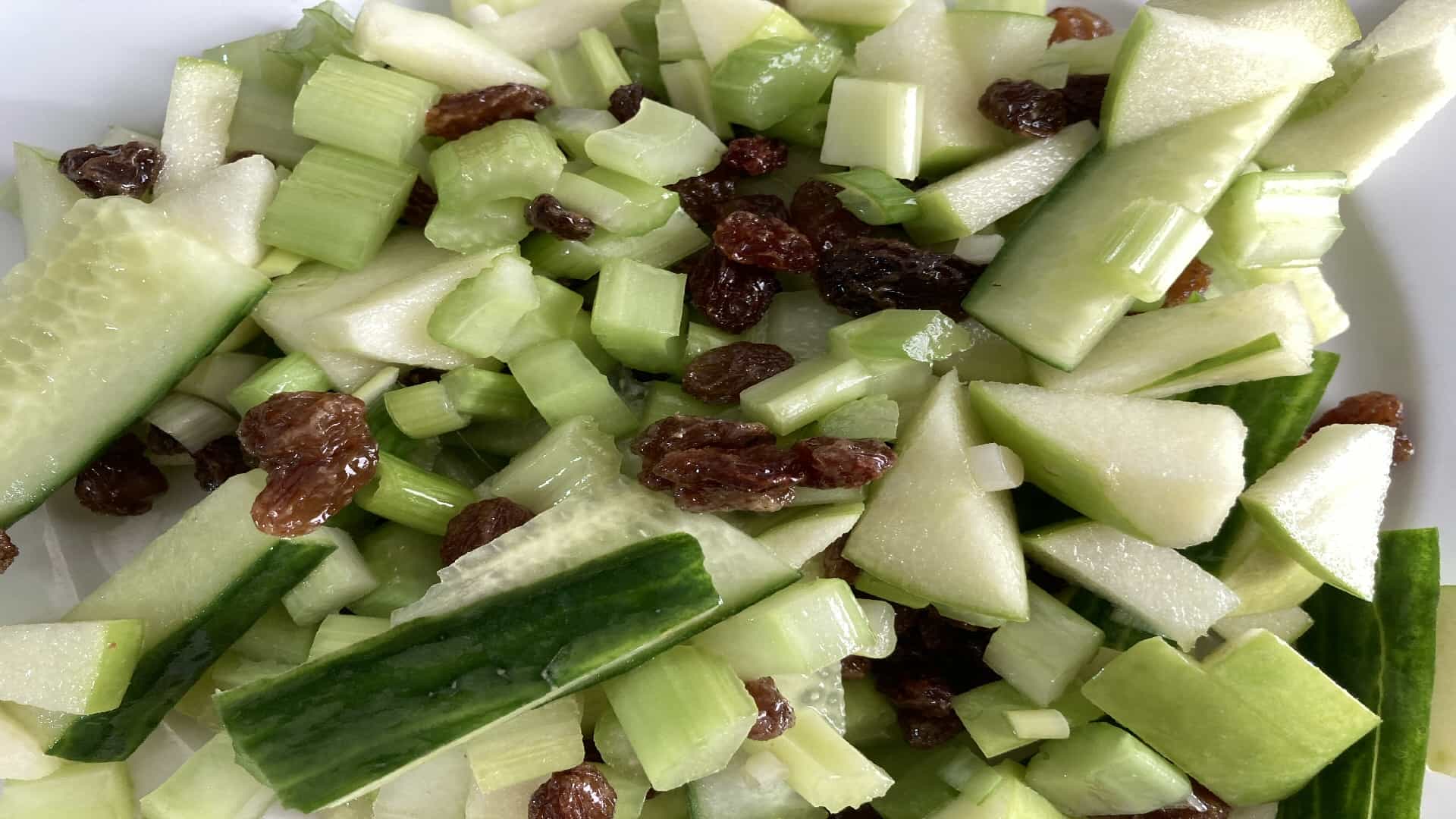 - Snij de appel in kleine blokjes en 1/3 van de komkommer in plakjes en in stukjes.