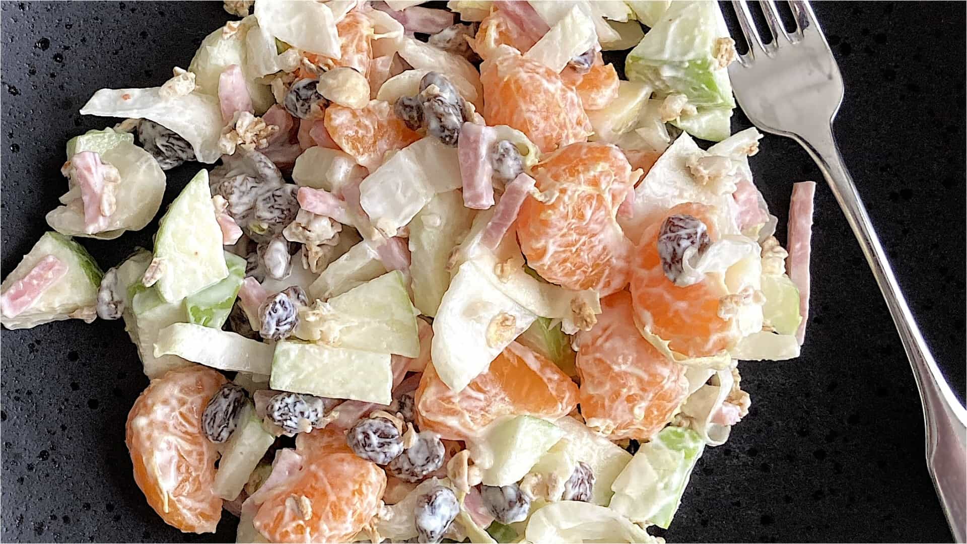 Serveer de salade op een bord en decoreer met de geplette nootjes als je daarvoor hebt gekozen.