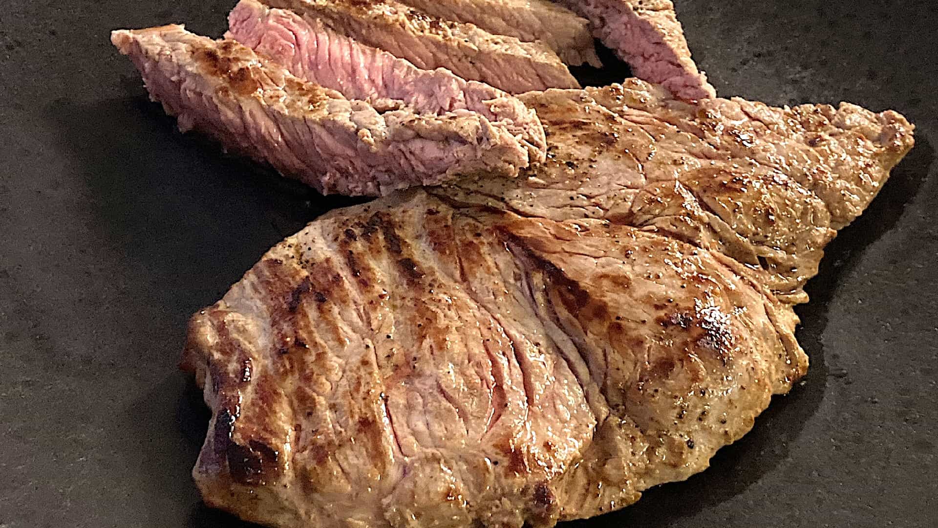 Snij een grote entrecote, na het bakken, doormidden als deze te groot is.