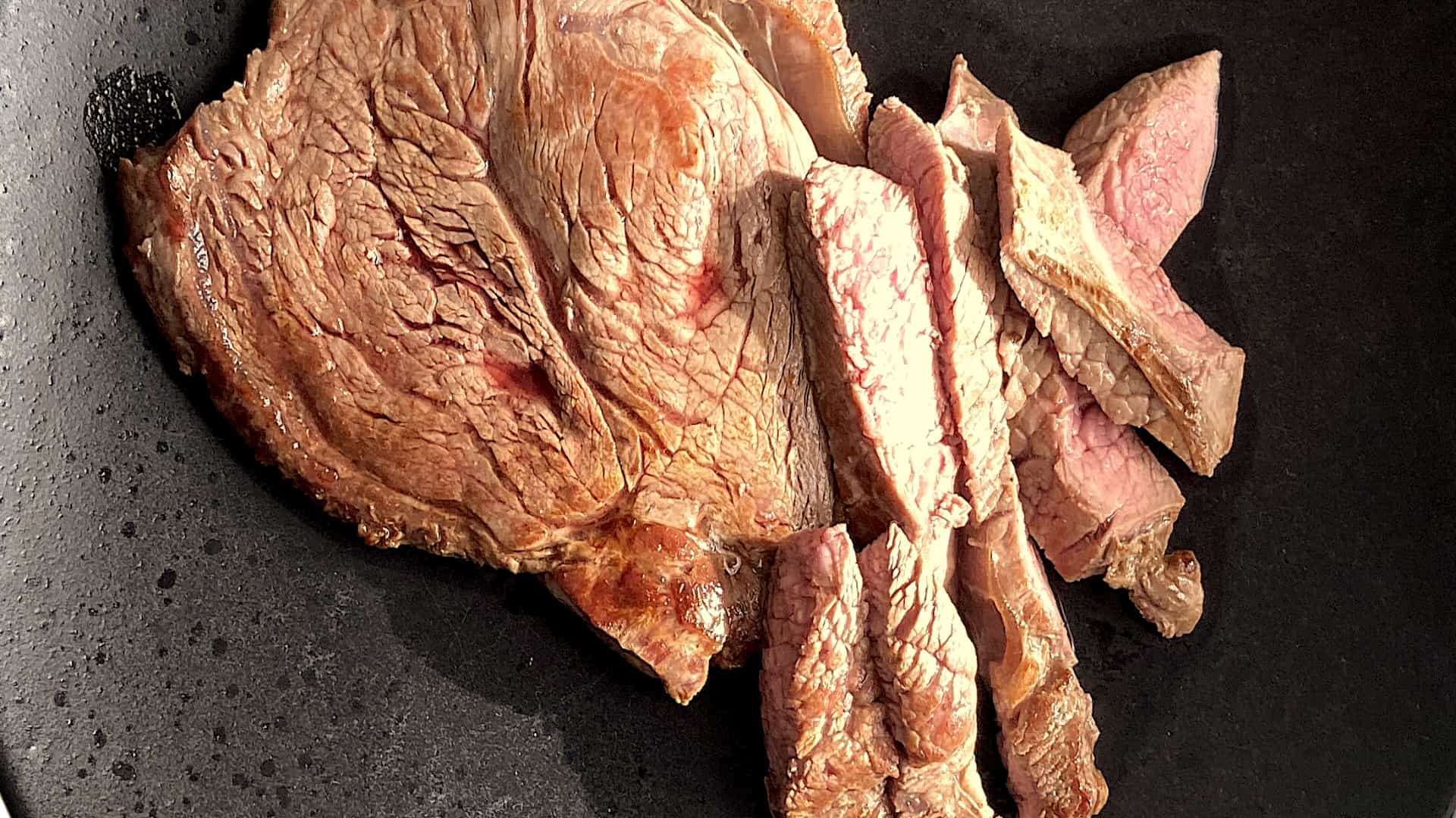Snij een grote ribeye, na het bakken, doormidden als deze te groot is.