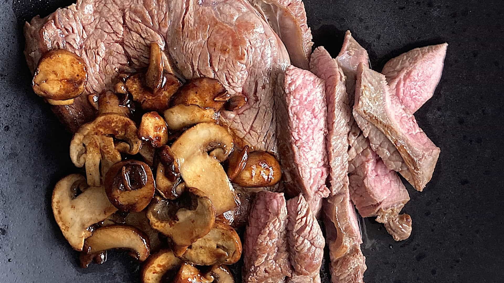 Voor de ribeye en de champignons heb je een flinke koekenpan nodig.