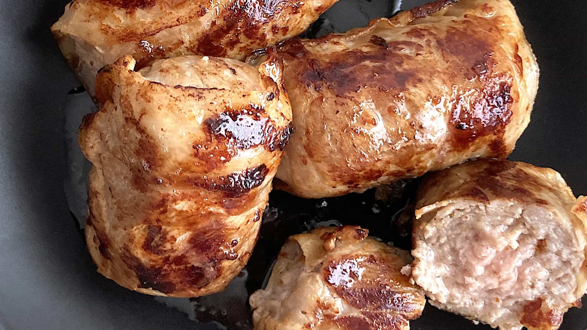 Keer de slavinken, tijdens het bakken, regelmatig om en beweeg ze over de bodem van de koekenpan.