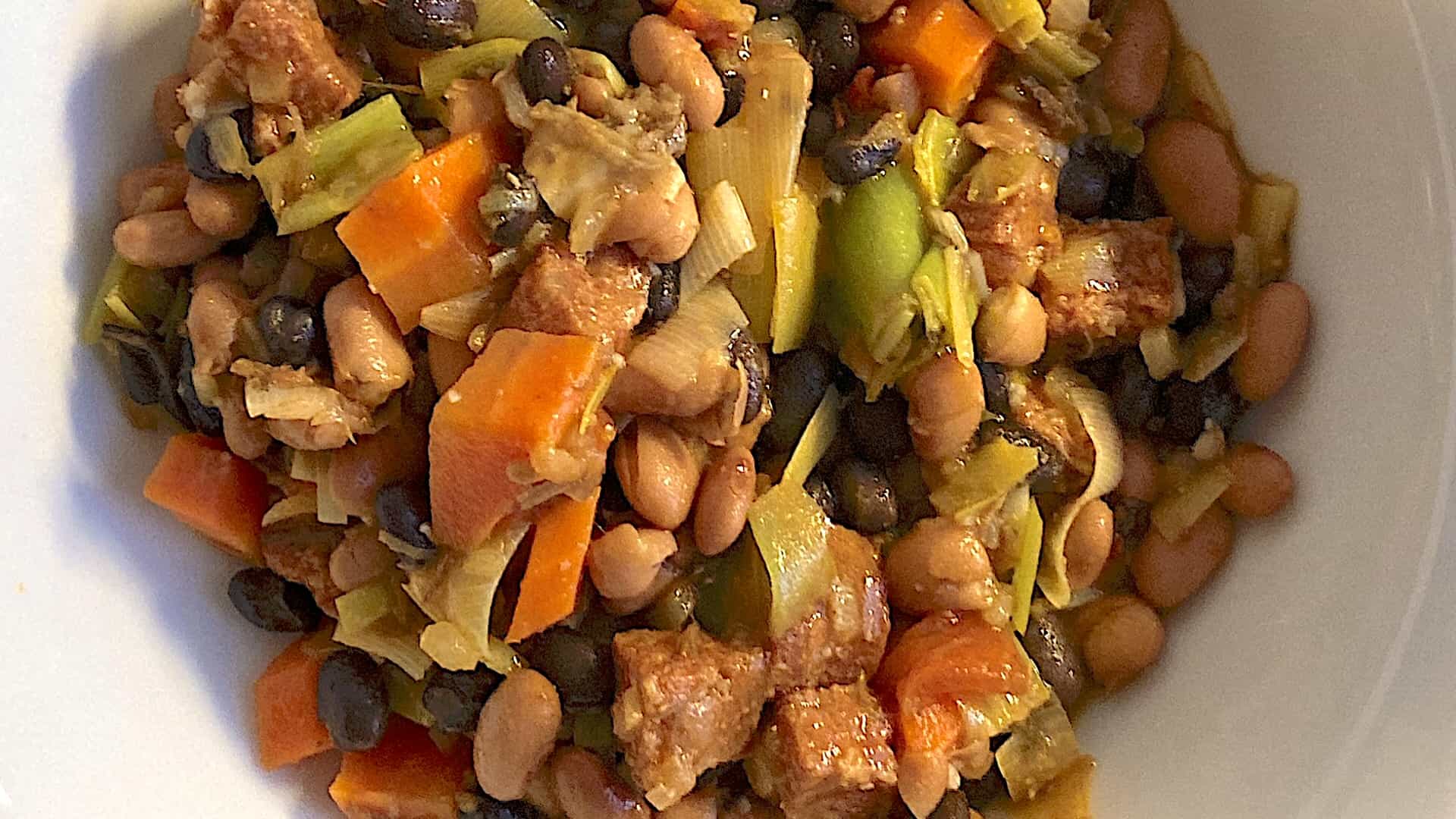 Serveer de bonenschotel op een bord en serveer er het brood bij.