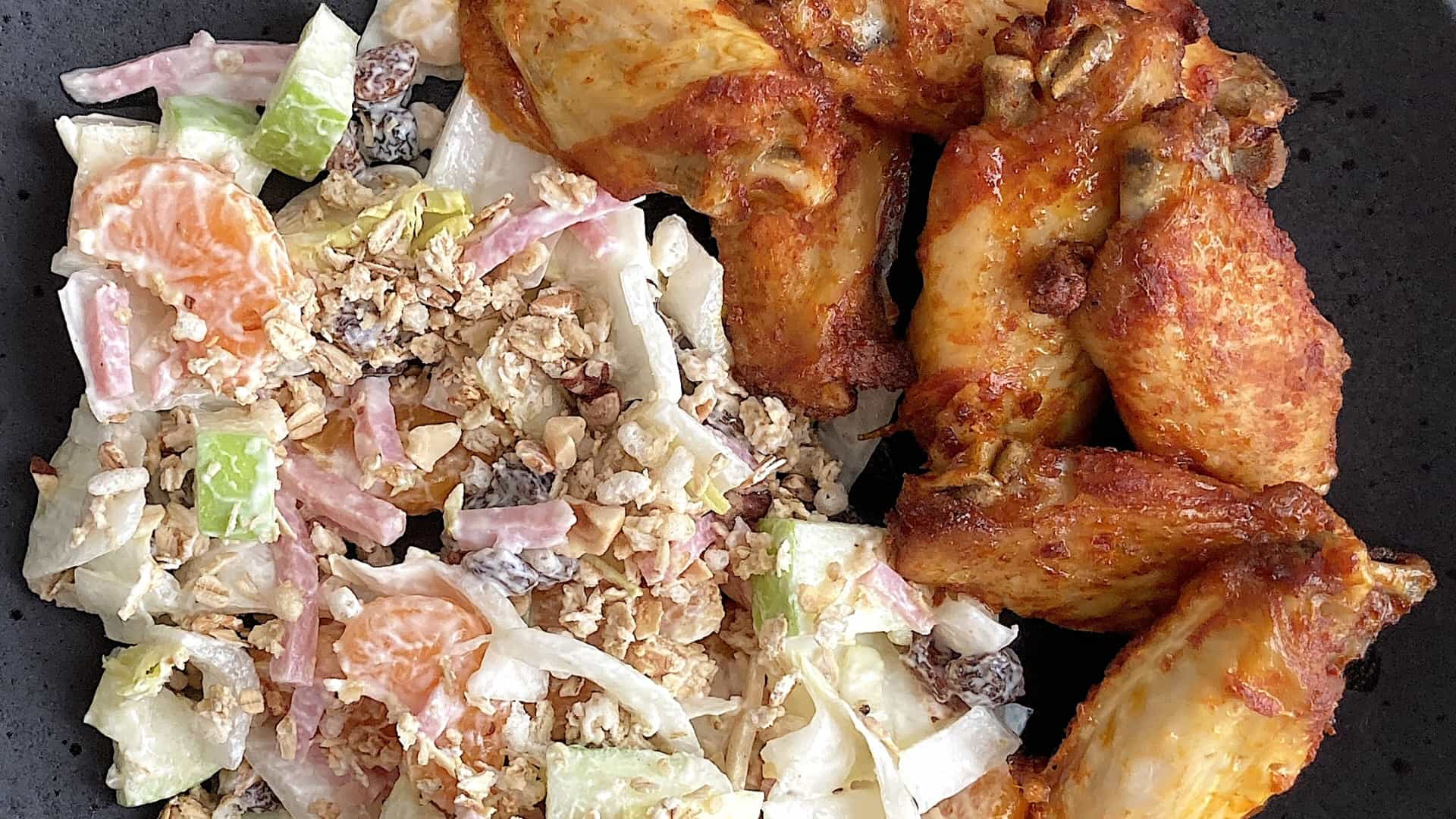 Serveer de kip en de witlofsalade op een bord. Strooi op de witlofsalade de cruesli.