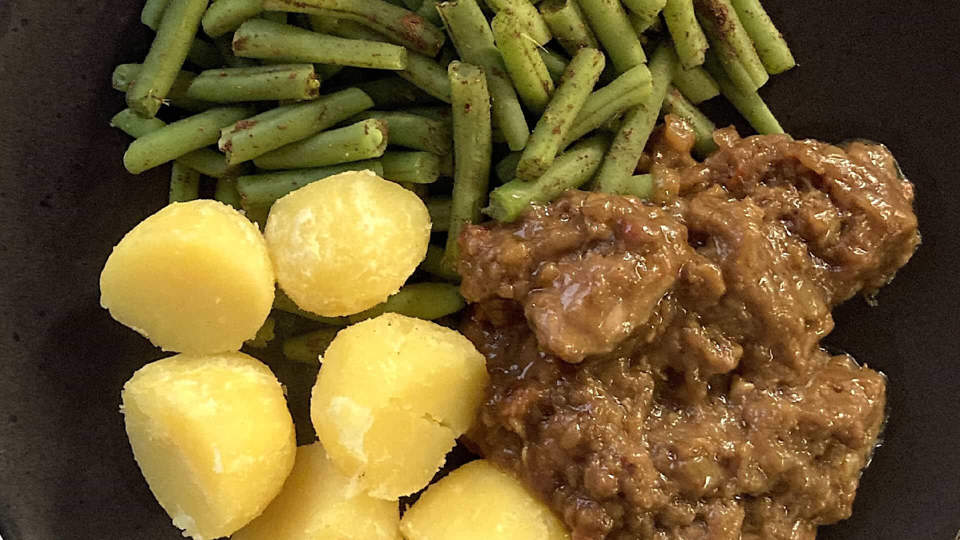 Kippendijen stoof met gekookte aardappelen en sperziebonen