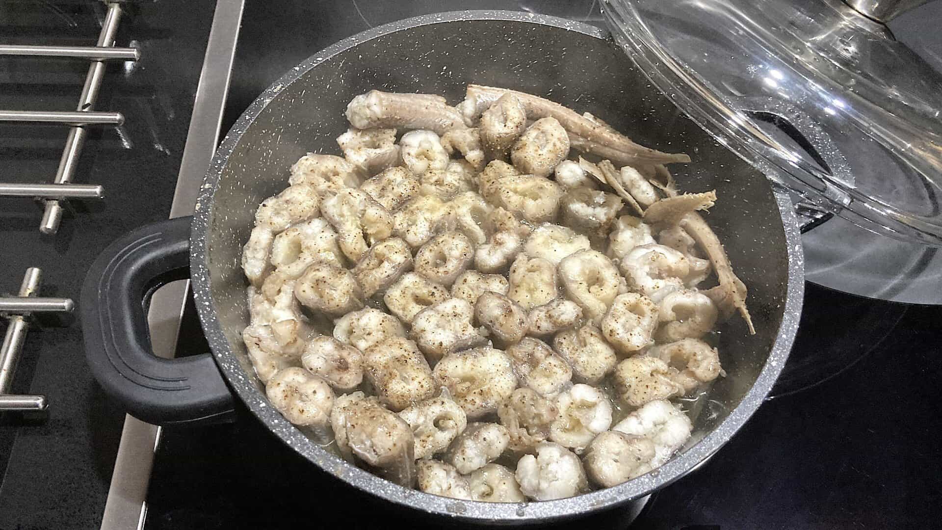 Geen water of andere vloeistoffen toevoegen. Paling stooft in dit recept gaar in het eigen vocht en vet.
