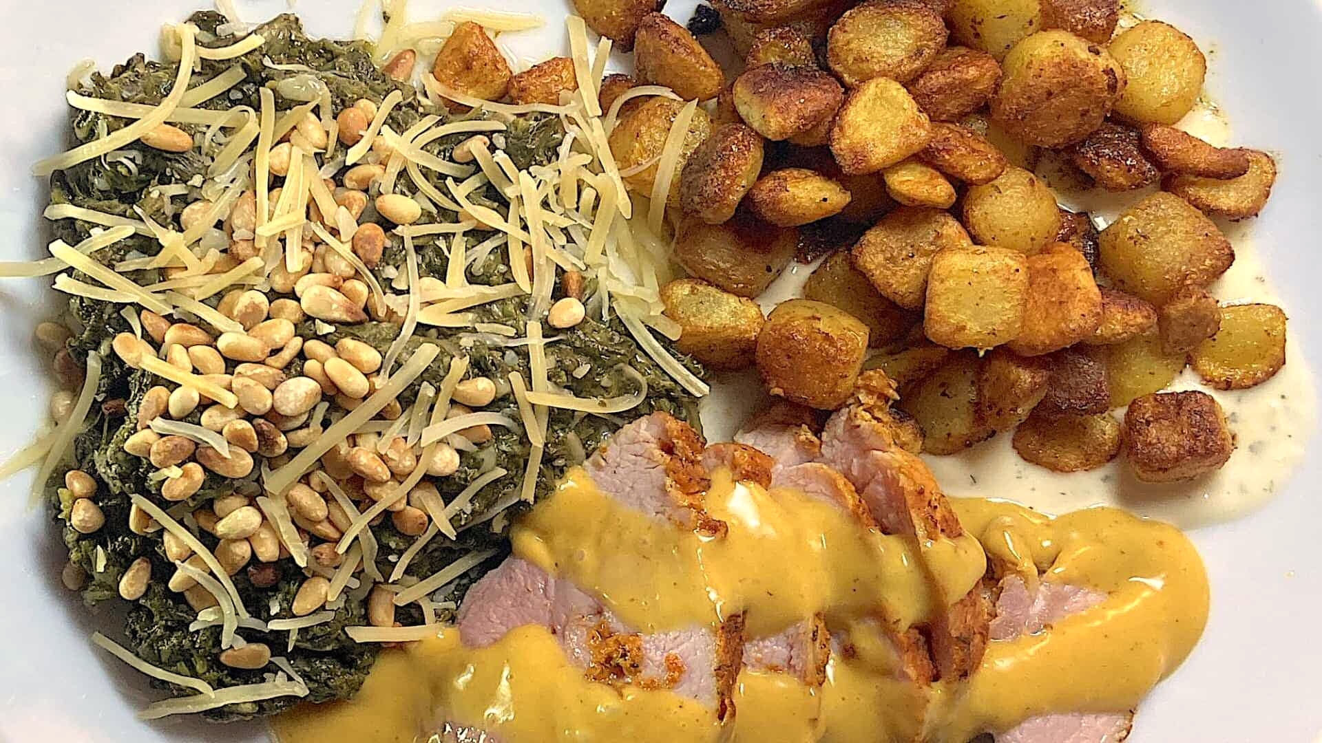 Voor de beenham heb je een oven nodig. Voor de minikrieltjes een koekenpan en voor de spinazie een steelpan.