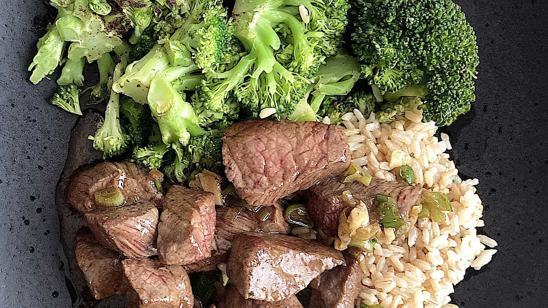 Voor de biefstuk en rijst heb je een koekenpan nodig en voor de broccoli een magnetron.