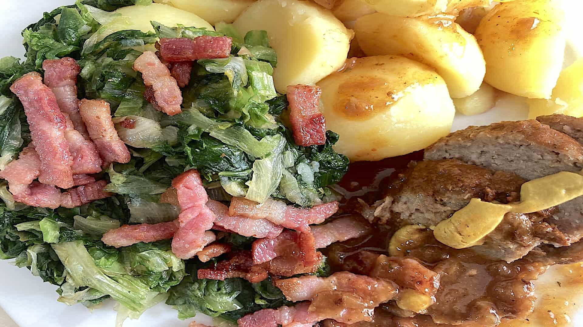 Voor de aardappelen en andijvie heb je 2 pannen nodig en voor de spekreepjes een koekenpan. De gehaktballen warm je op zoals op de verpakking staat.