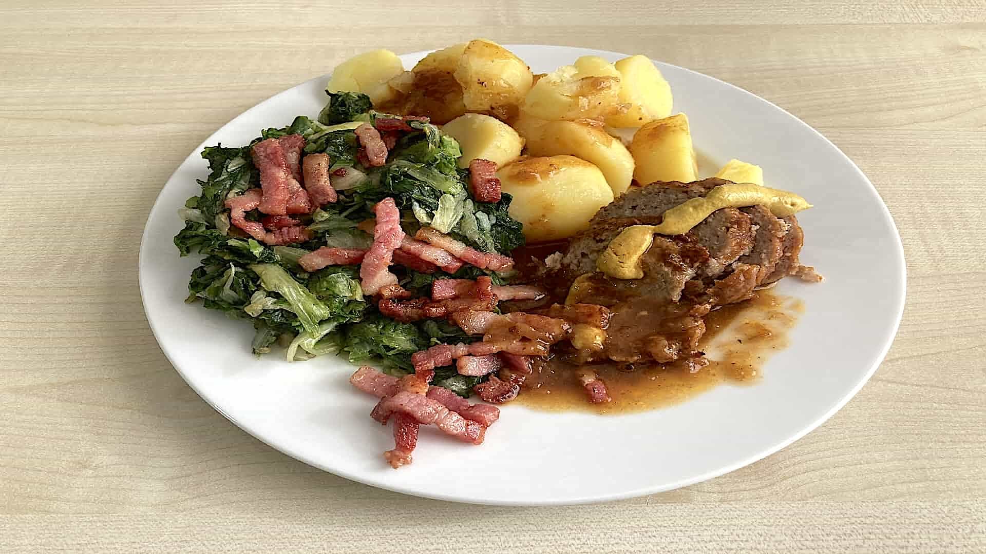 Serveer de andijvie en aardappelen op een plat bord en strooi hierop de gebakken spekreepjes. Snijd de gehaktbal in vieren en leg er een sliertje mosterd op. Giet de jus over de aardappelen.
