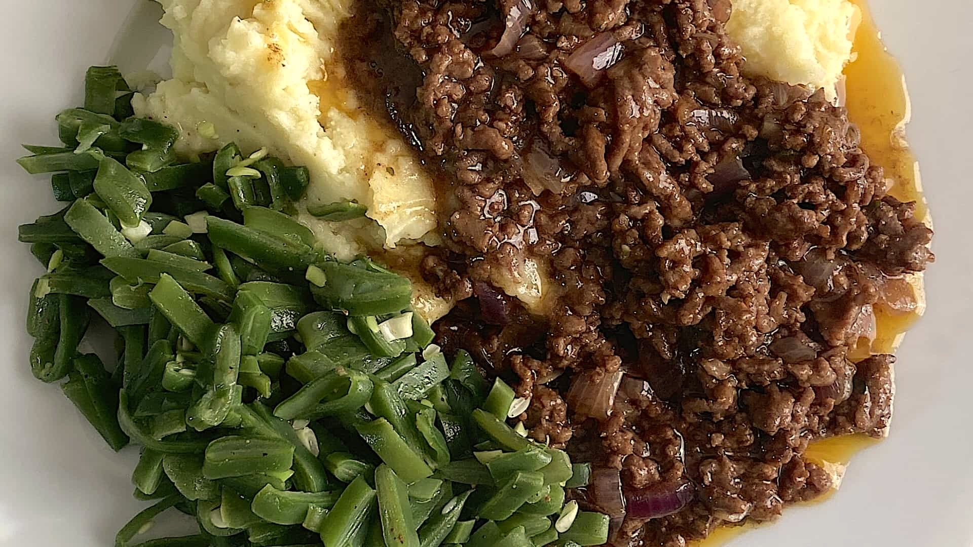 Serveer de hachee, puree en snijbonen op een plat bord en strooi wat nootmuskaat over de snijbonen.