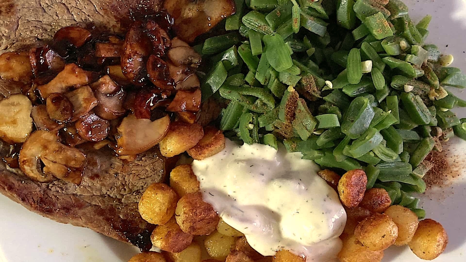 Serveer de ribey op een plat bord, bedek met de champignons en strooi een snufje zout over de krieltjes. Deponeer de snijbonen en krieltjes ernaast met een dotje saus.