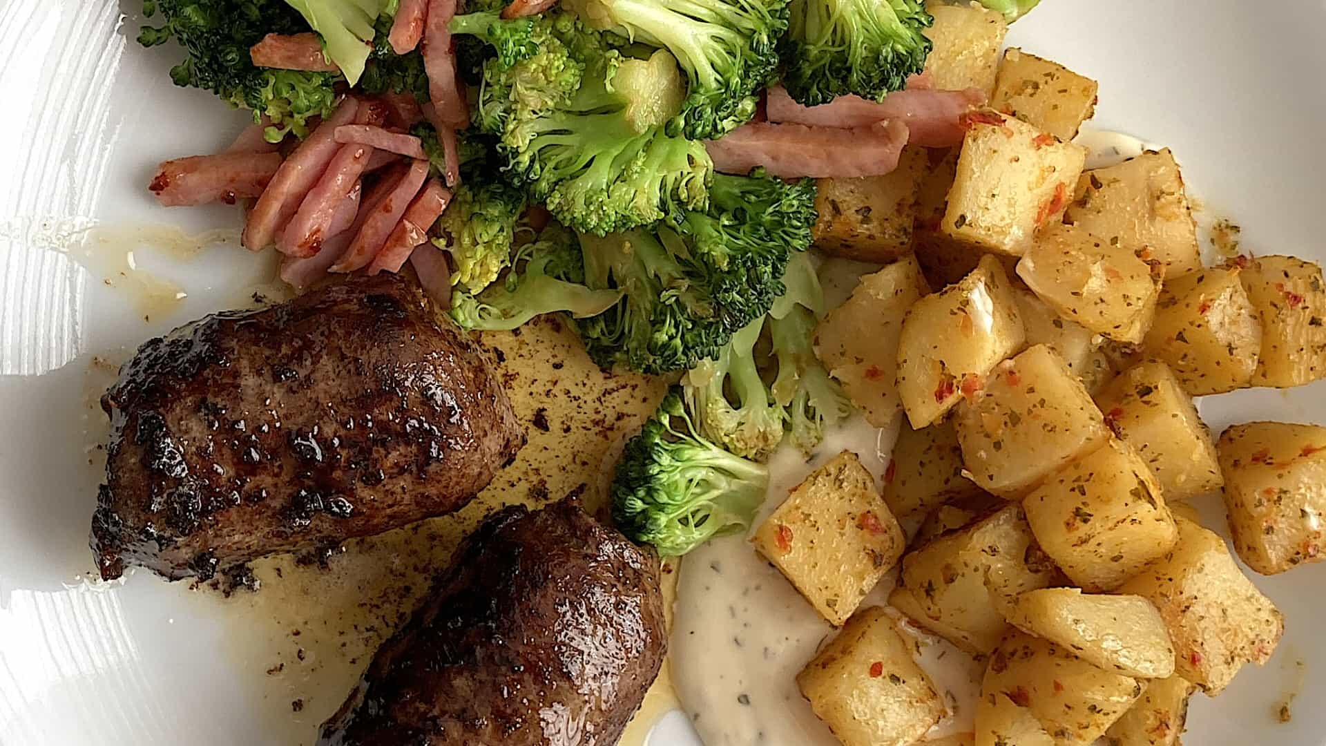 Serveer op een bord. Deponeer de aardappelblokjes op een bedje van knoflooksaus.