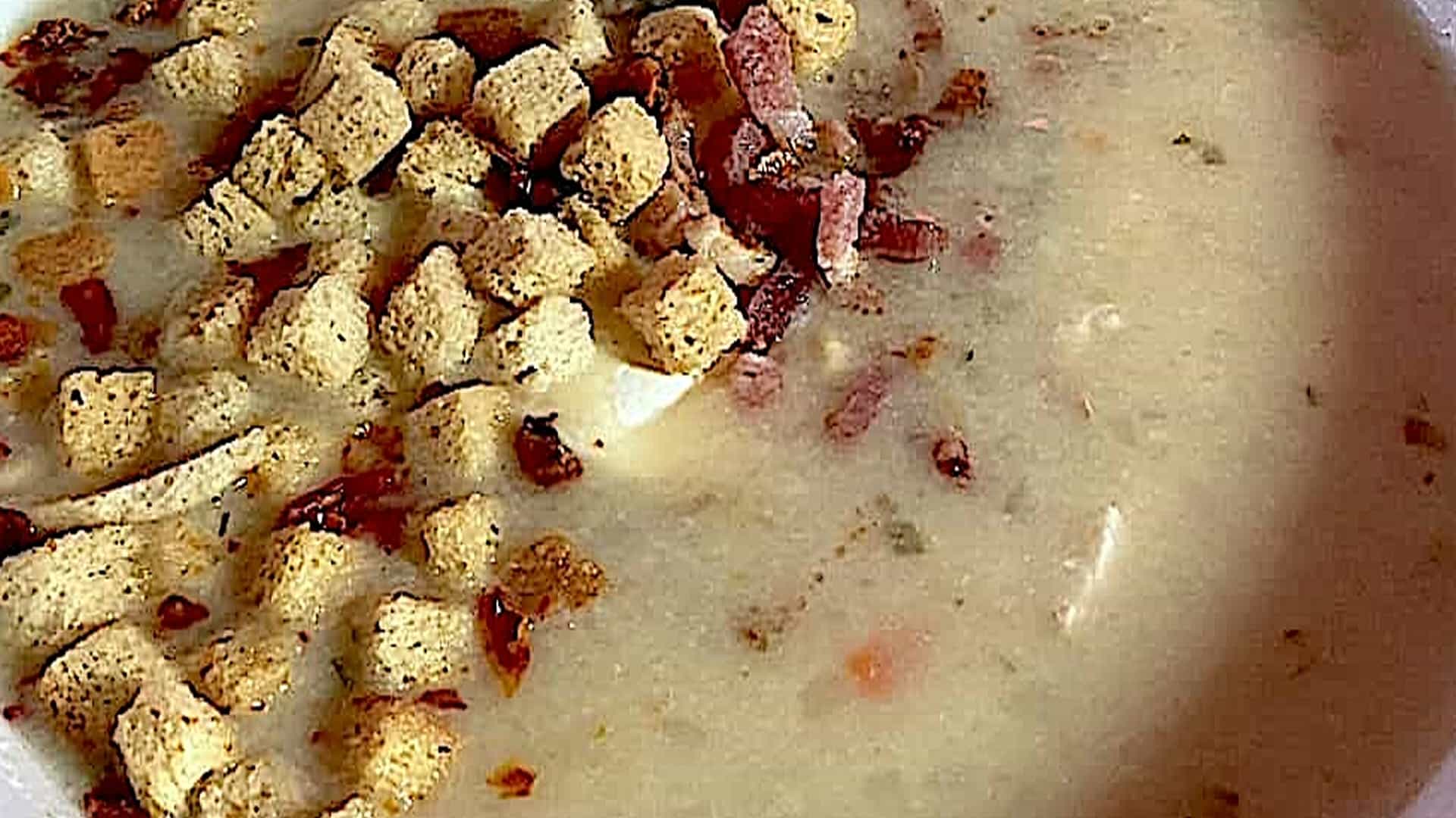 Serveer de soep in een diep bord of soepkom. Leg 1 eetlepel crème fraîche op de soep. Strooi de spekreepjes en/of de croutons hier overheen. Breek het brood of snij in stukken en serveer op een schaal of plankje.