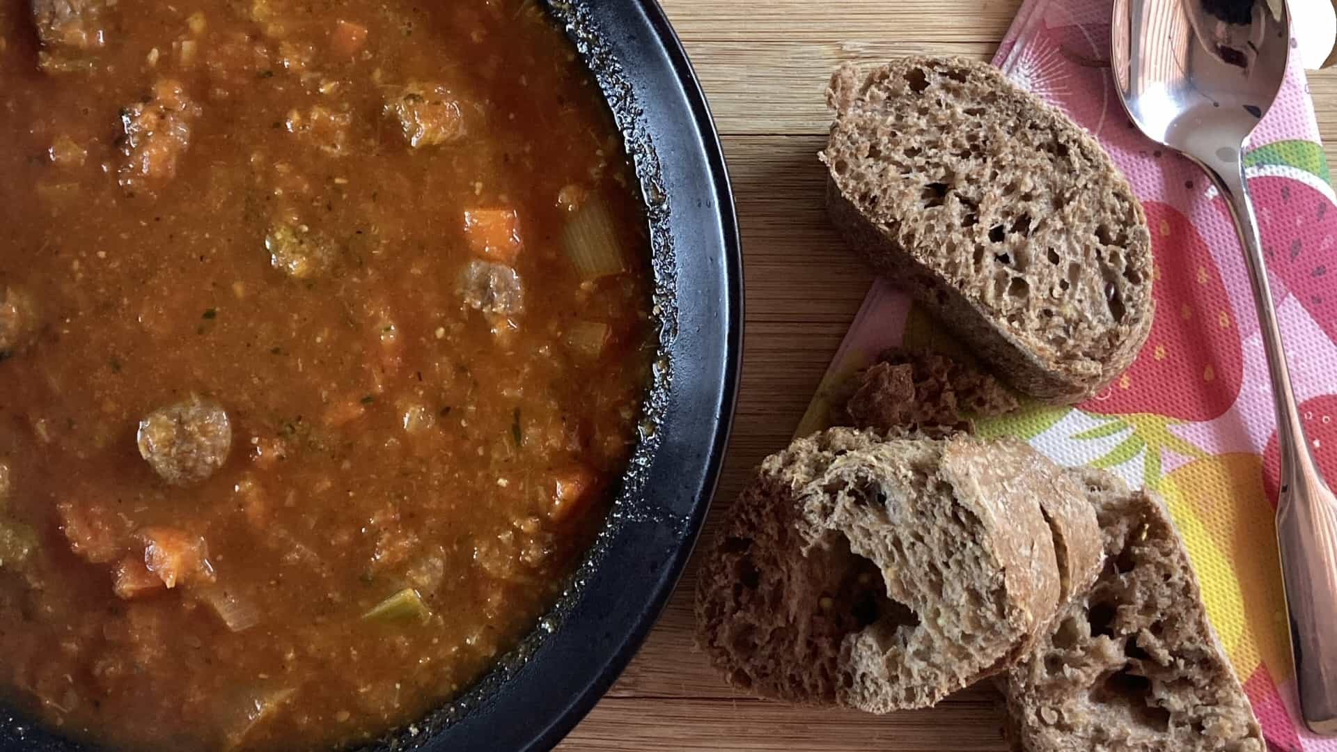 Serveer de soep in een diep bord of soepkom met een lekker knapperig stokbroodje.
