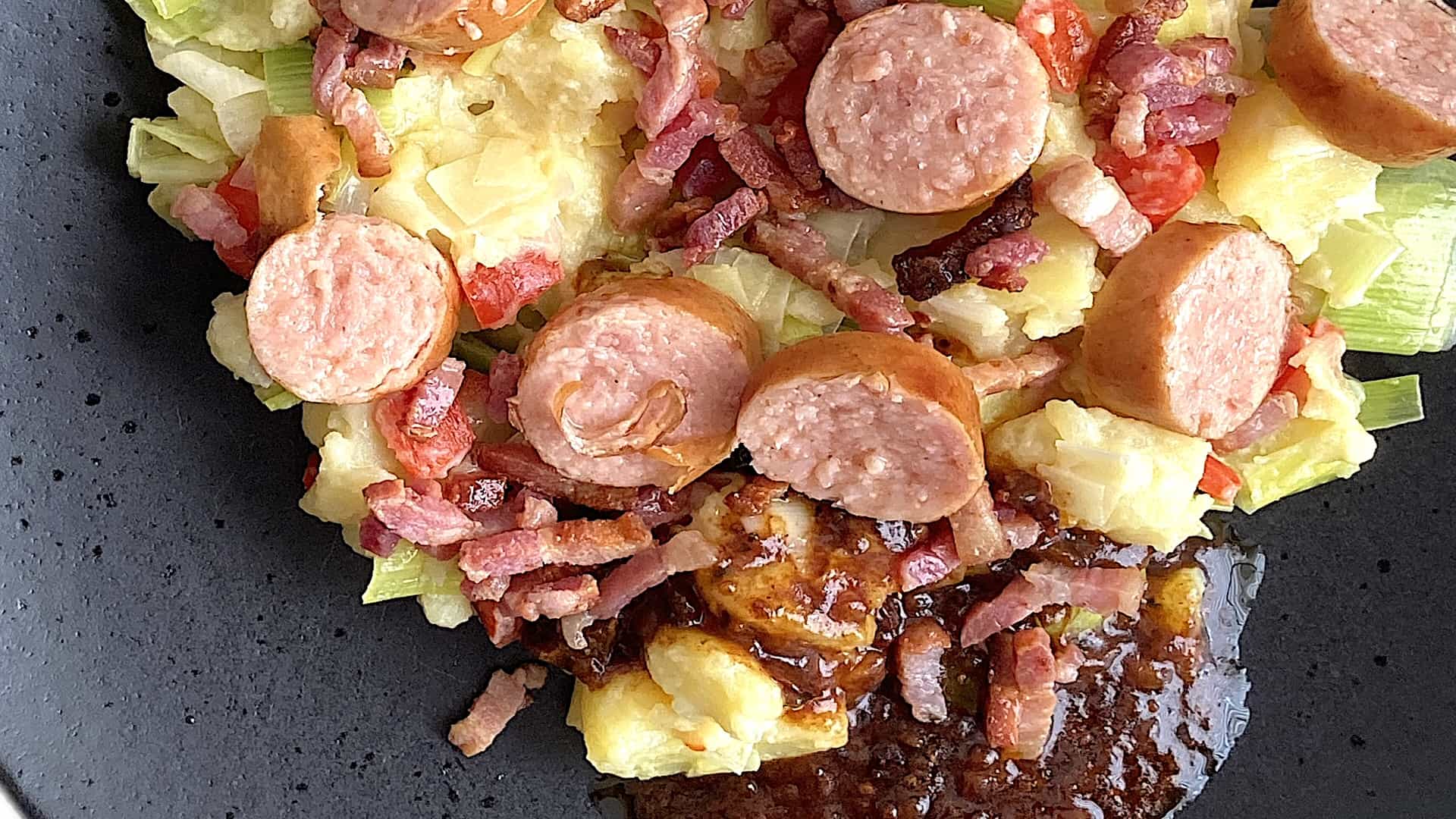 Serveer de stamppot met de plakjes rookworst op een bord. Strooi er de gebakken spekjes over.