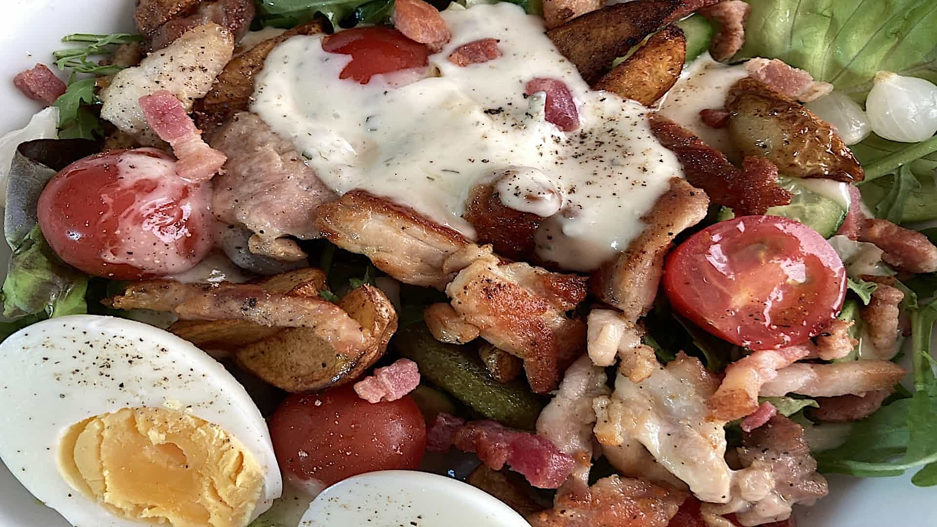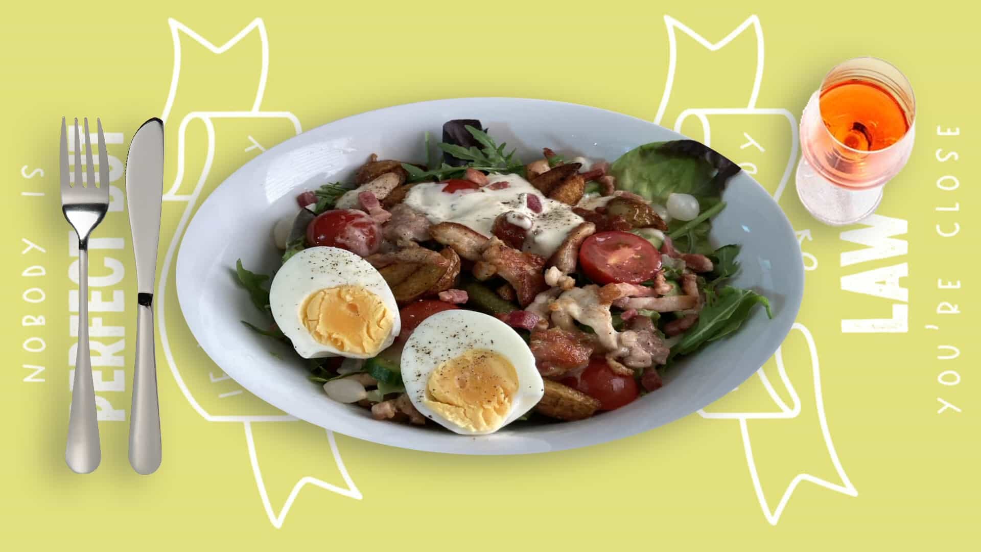 Serveer de maaltijdsalade op een diep bord. Garneer eventueel met de eieren en olijfen. 2 slagen met de pepermolen en smullen maar.