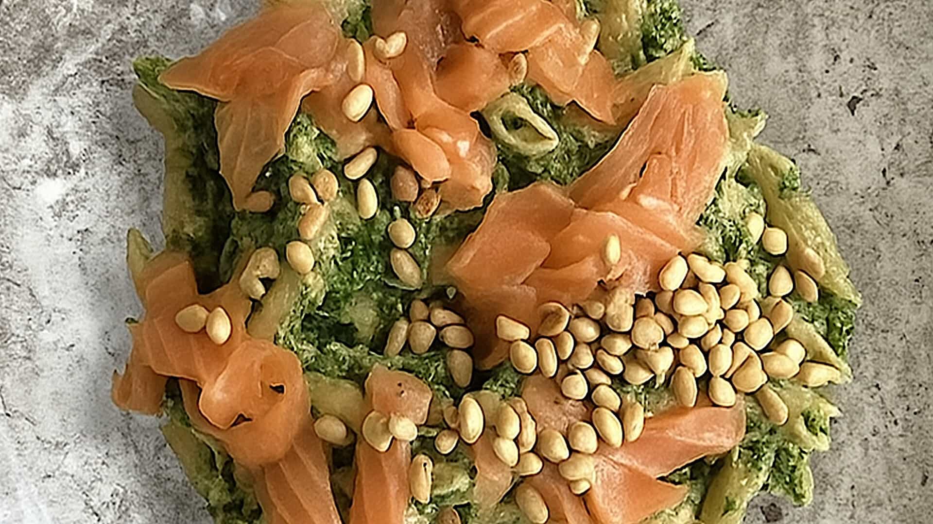 Serveer de penne in een diep bord. Verdeel de zalm over de porties en strooi er de geroosterde pijnboompitten overheen.