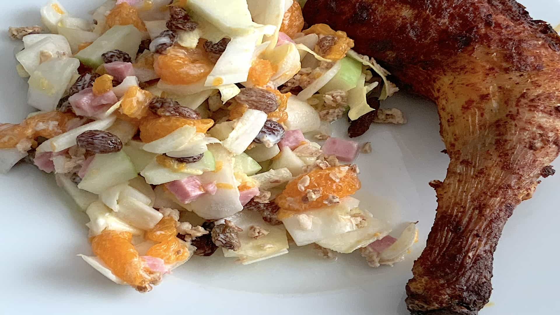 Serveer de witlofsalade met kip op een plat bord. Strooi er Cruesli over.