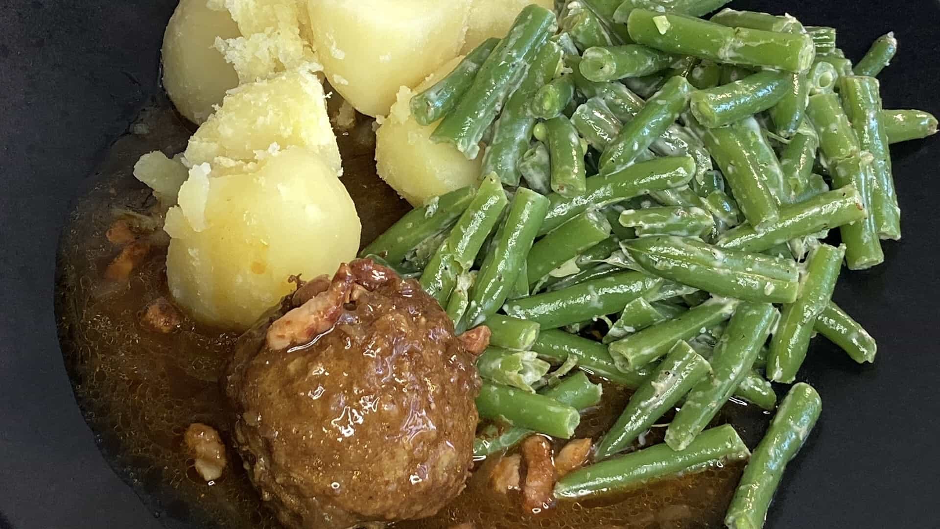 Voor de aardappelen en sperziebonen heb je een kookpan nodig en voor de gehaktballen een magnetron.