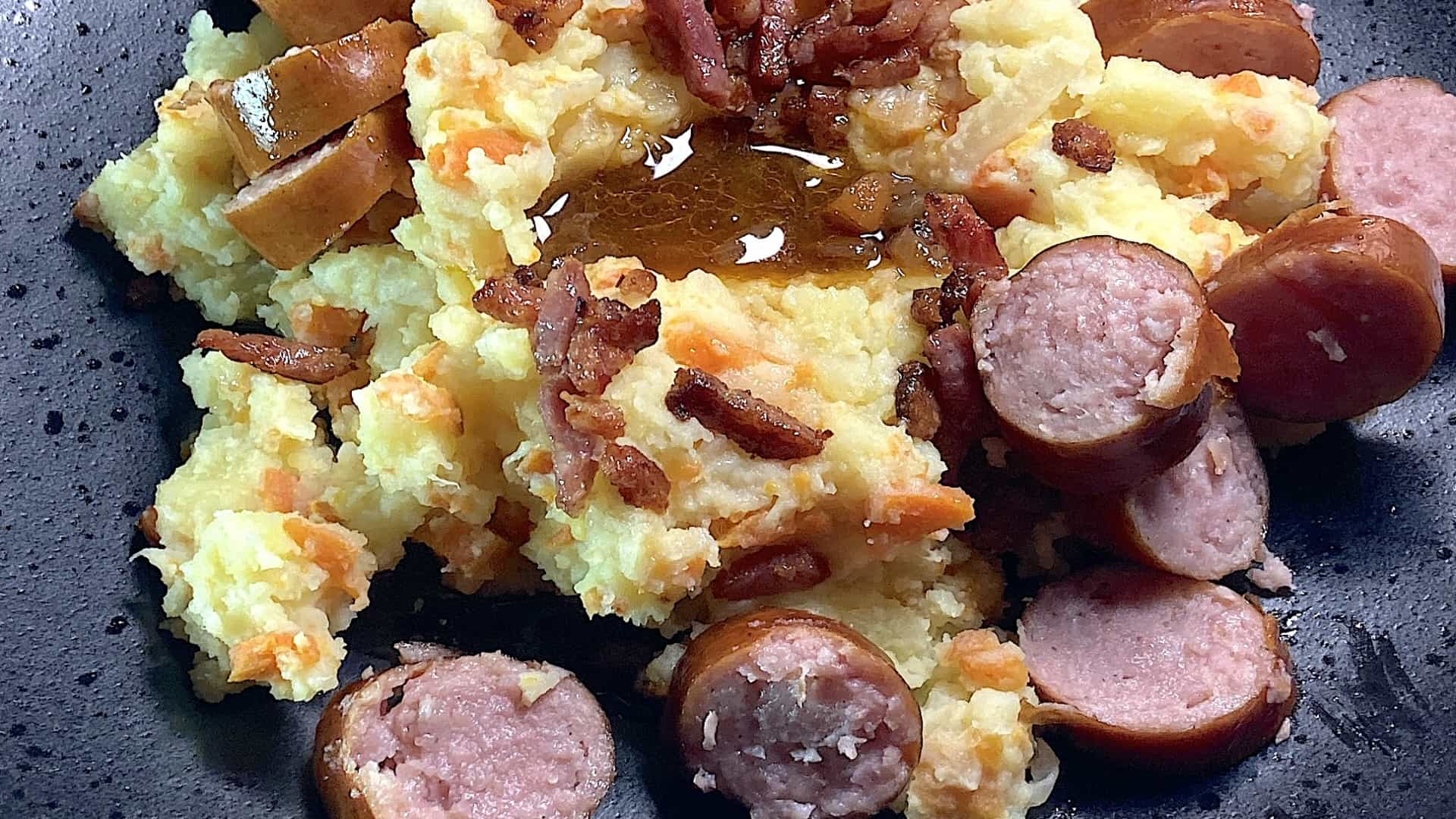 Serveer de hutspot met de rookworst en strooi er de spekreepjes overheen.