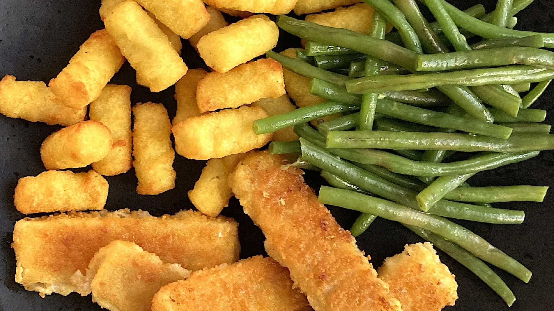 Voor de vissticks heb je een koekenpan nodig. Voor de aardappel kroketjes een airfryer en voor de haricots verts een kookpan.