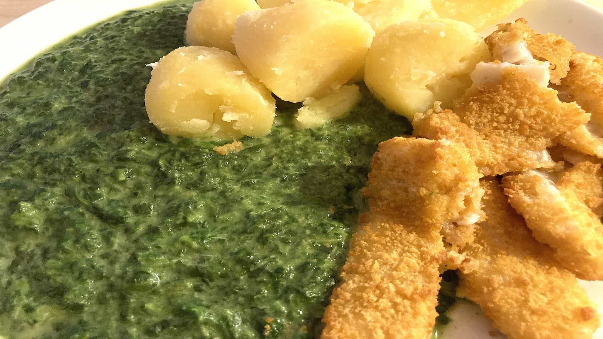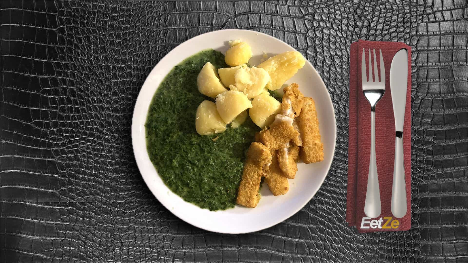 De vis verwarm je in een koekenpan, oven, airfryer of frituur. De aardappelen kook je in een kookpan. De spinazie verwarm je in een pan.