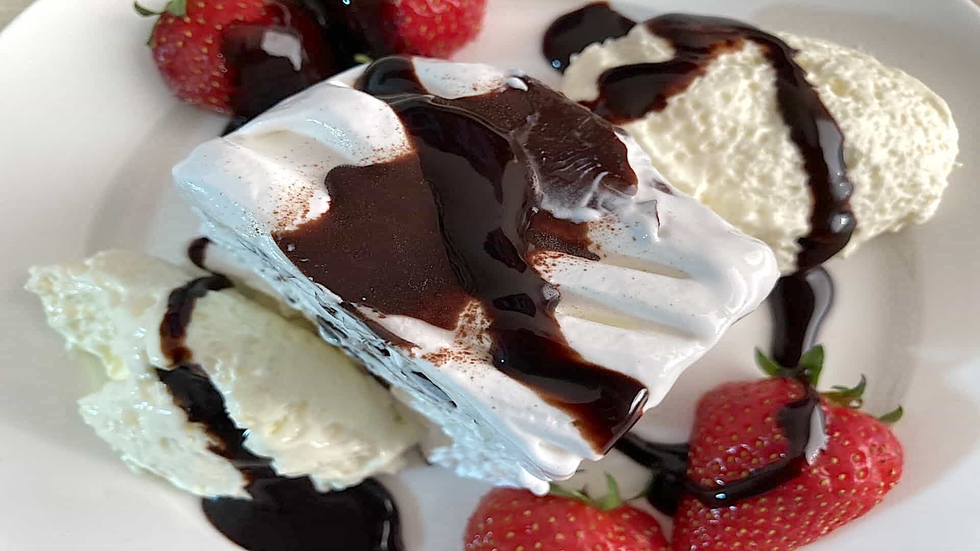 - Deponeer het ijs op een bordje en schep er 2 eetlepels slagroom bij.