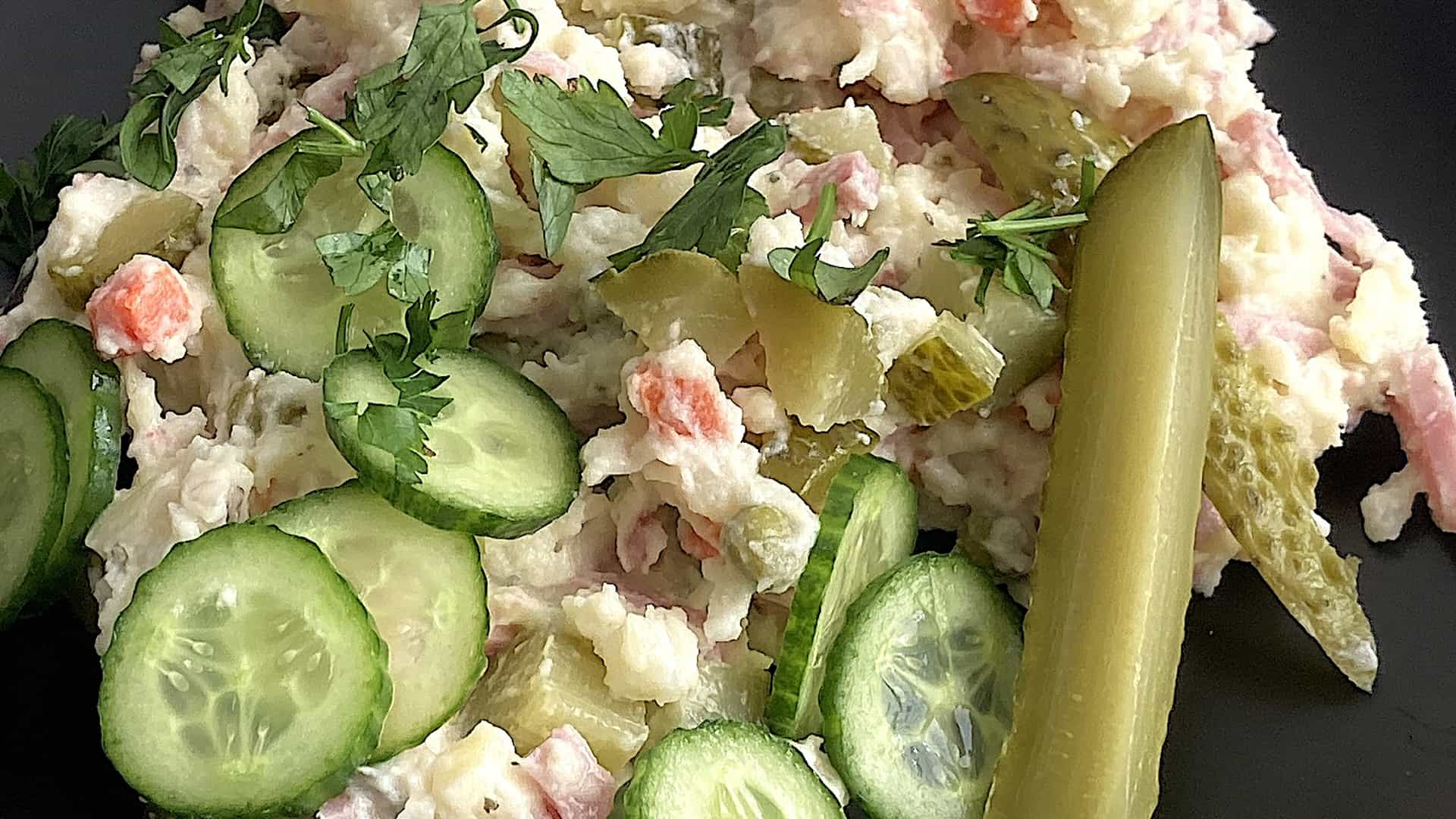 Serveer de huzarensalade op een bord bij je hoofdgerecht. Garneer met de komkommer, augurk en peterselie.