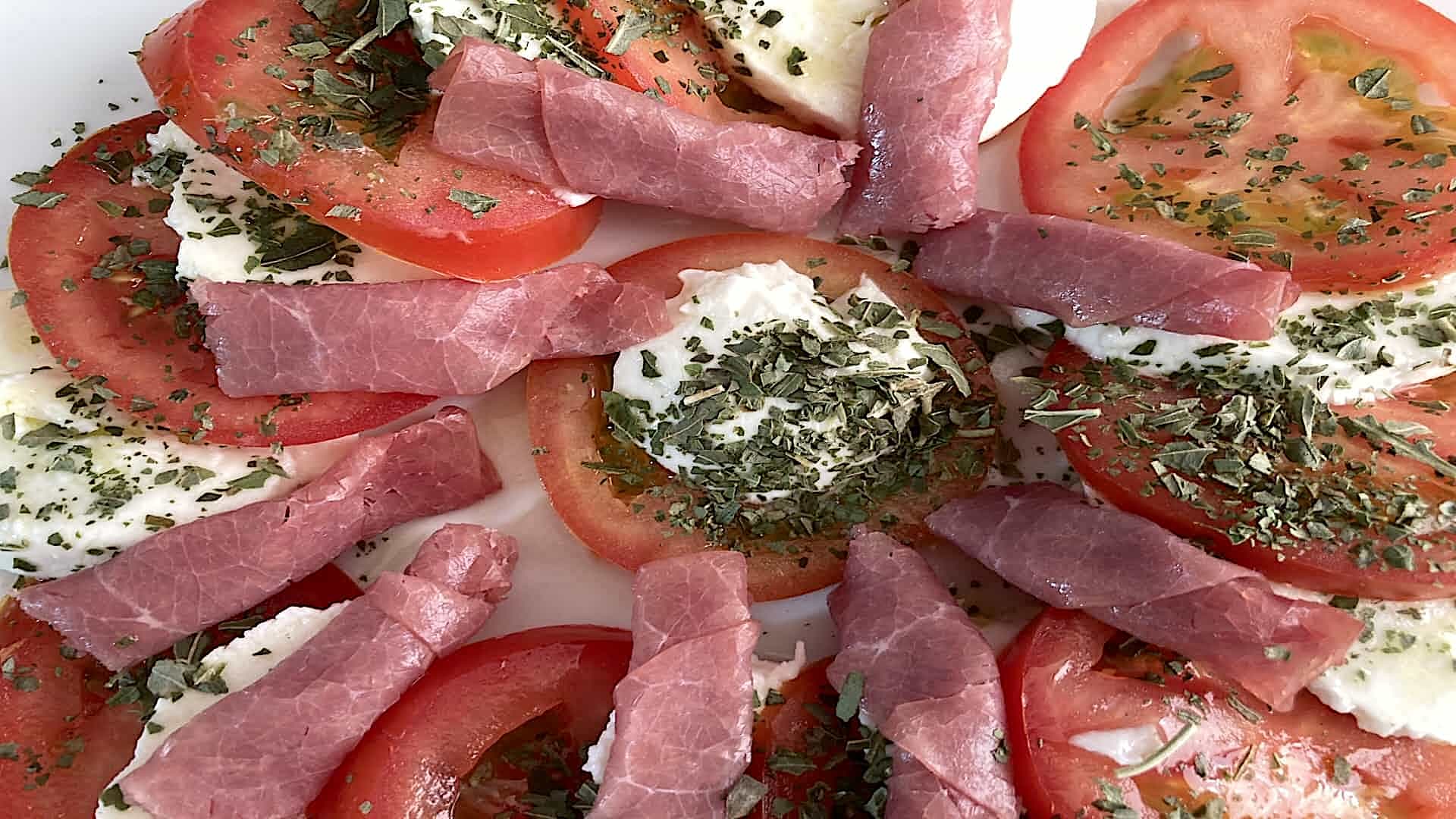 Vervang het rookvlees door dunne plakjes ham als je niet van rookvlees houdt.