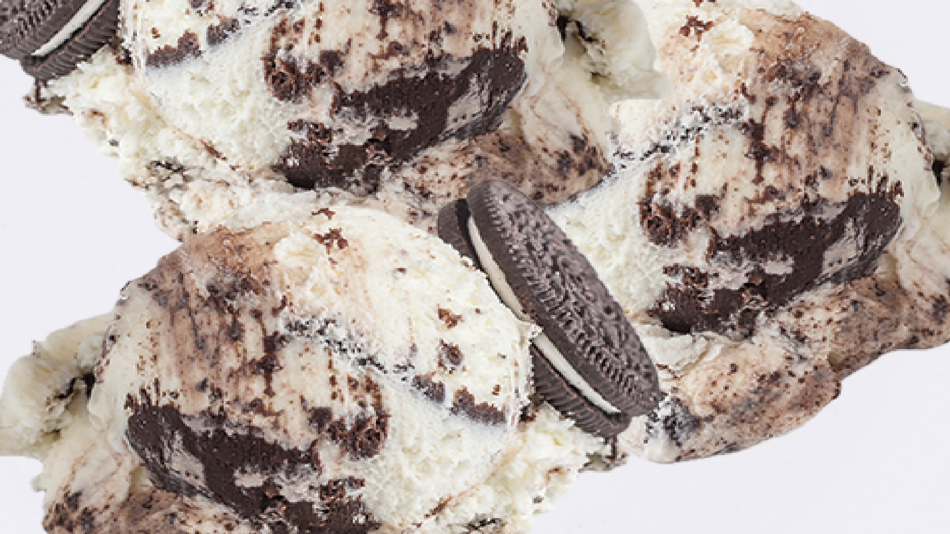 Serveer op een plat wit bord. Steek nog 1 of 2 oreokoejes in het ijs.