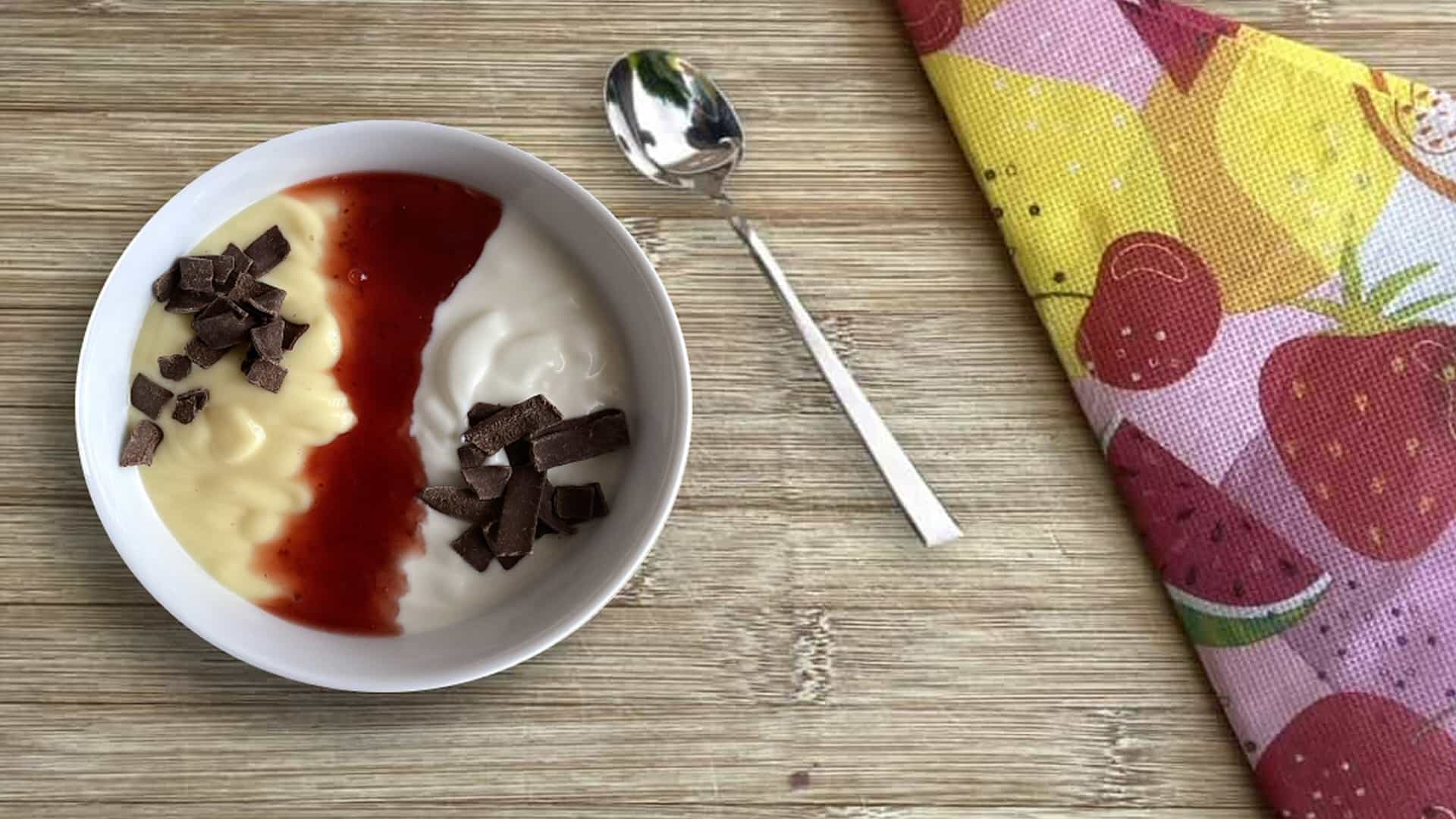 Serveer de vlayo in een kom of schaal en giet wat dessertsaus tussen de vla en de yogurt.