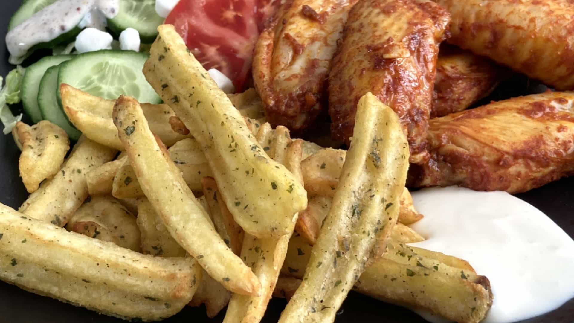 Voor de friet heb je nodig een airfryer en voor de kipvleugels een oven met een ovenschaal.