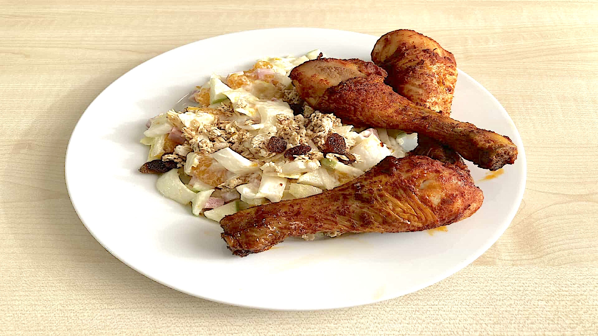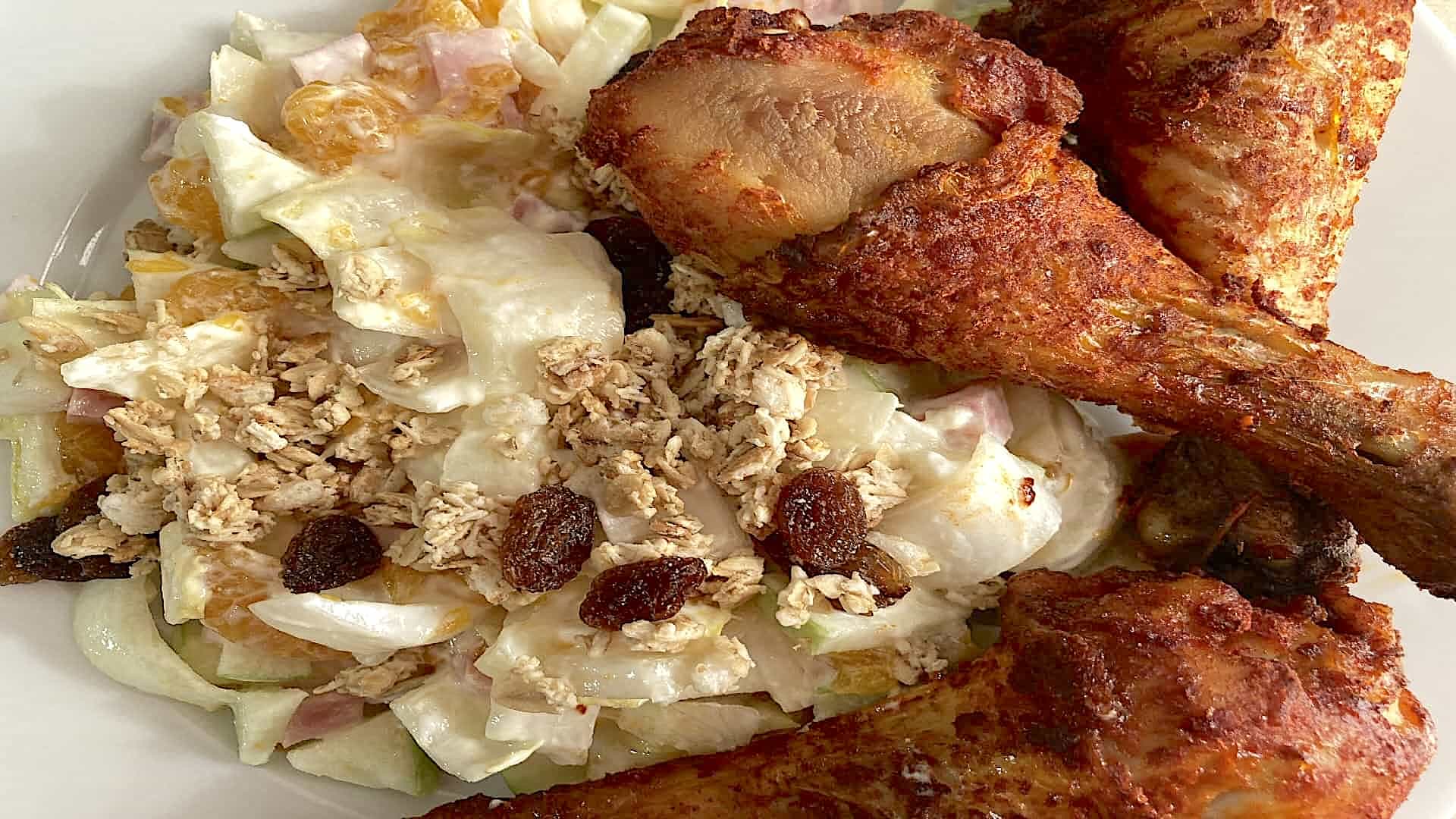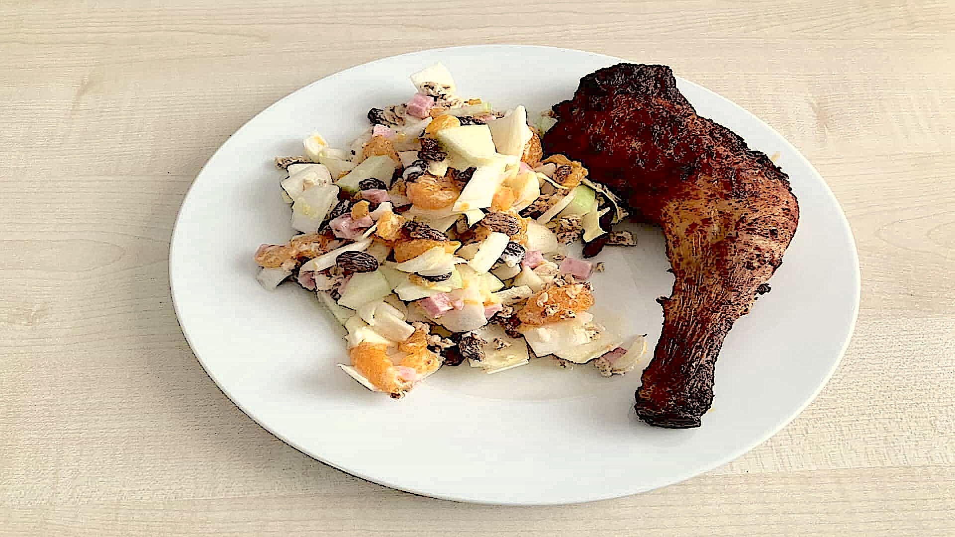 Serveer de kip en de witlofsalade op een plat bord. Strooi op de witlofsalade de cruesli.