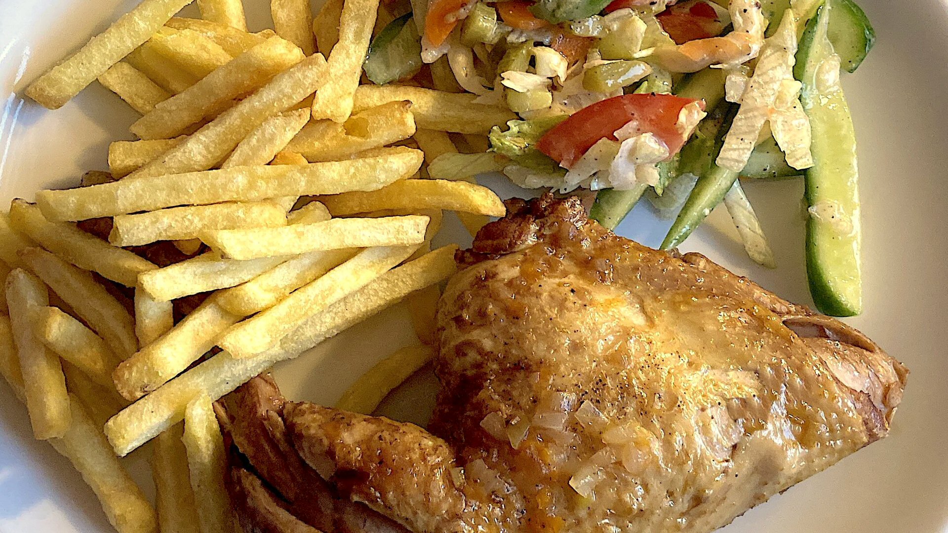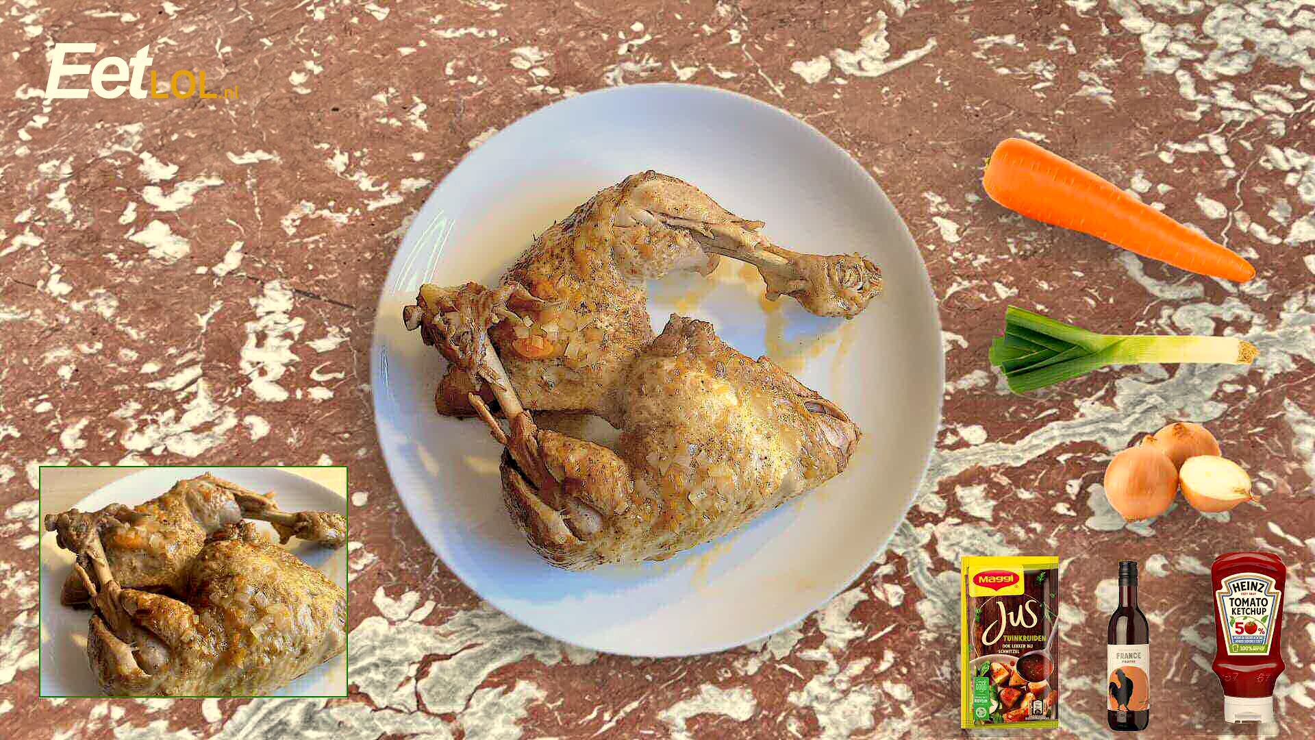 Je hebt voor de kip een braadpan of hapjespan met deksel nodig en voor de friet een airfryer.