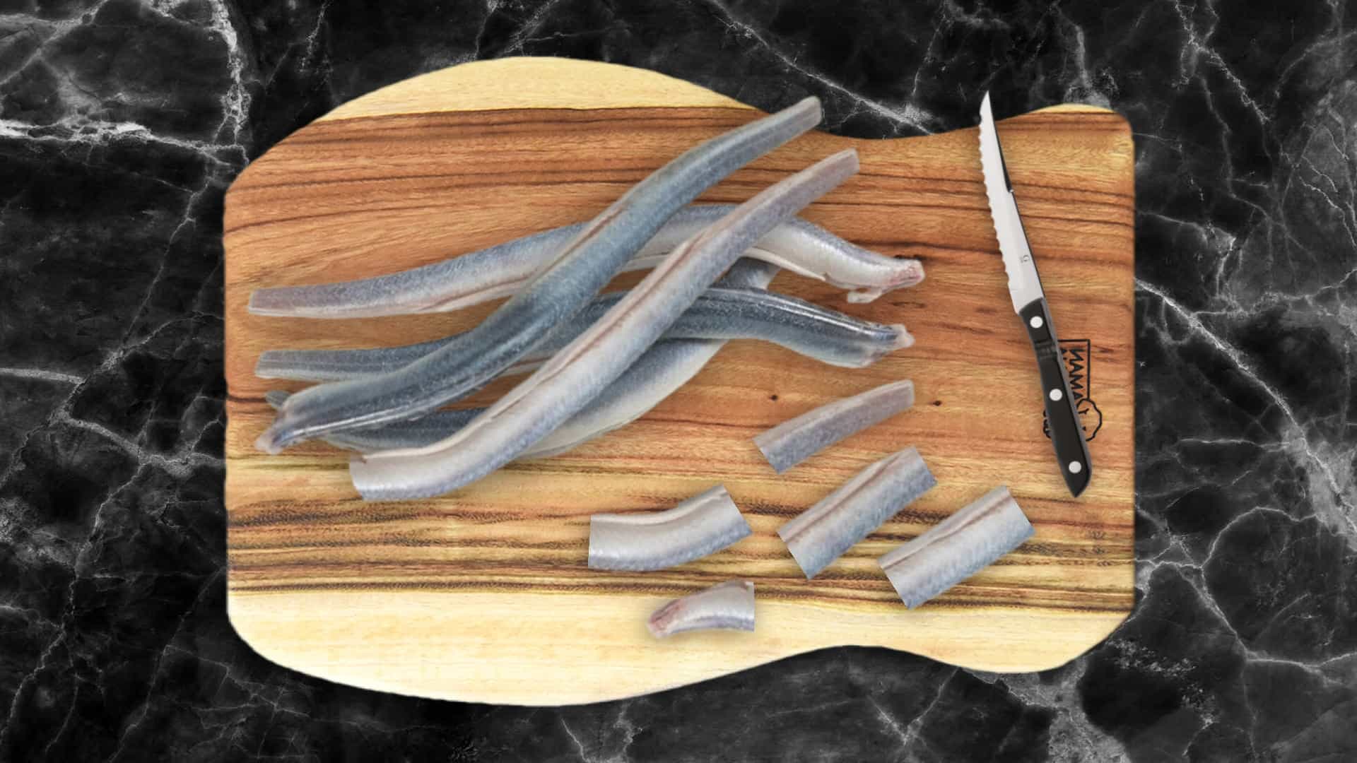 Uit iedere paling haal je 4 stukjes van 5 cm. De staartjes stoof je mee bovenop op de mootjes paling of geef je aan de poes.