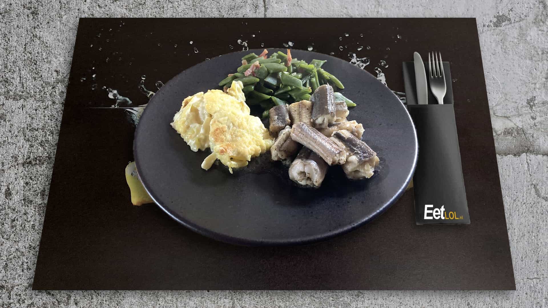 Geen water of andere vloeistoffen toevoegen. Paling stooft in dit recept gaar in het eigen vocht en vet.