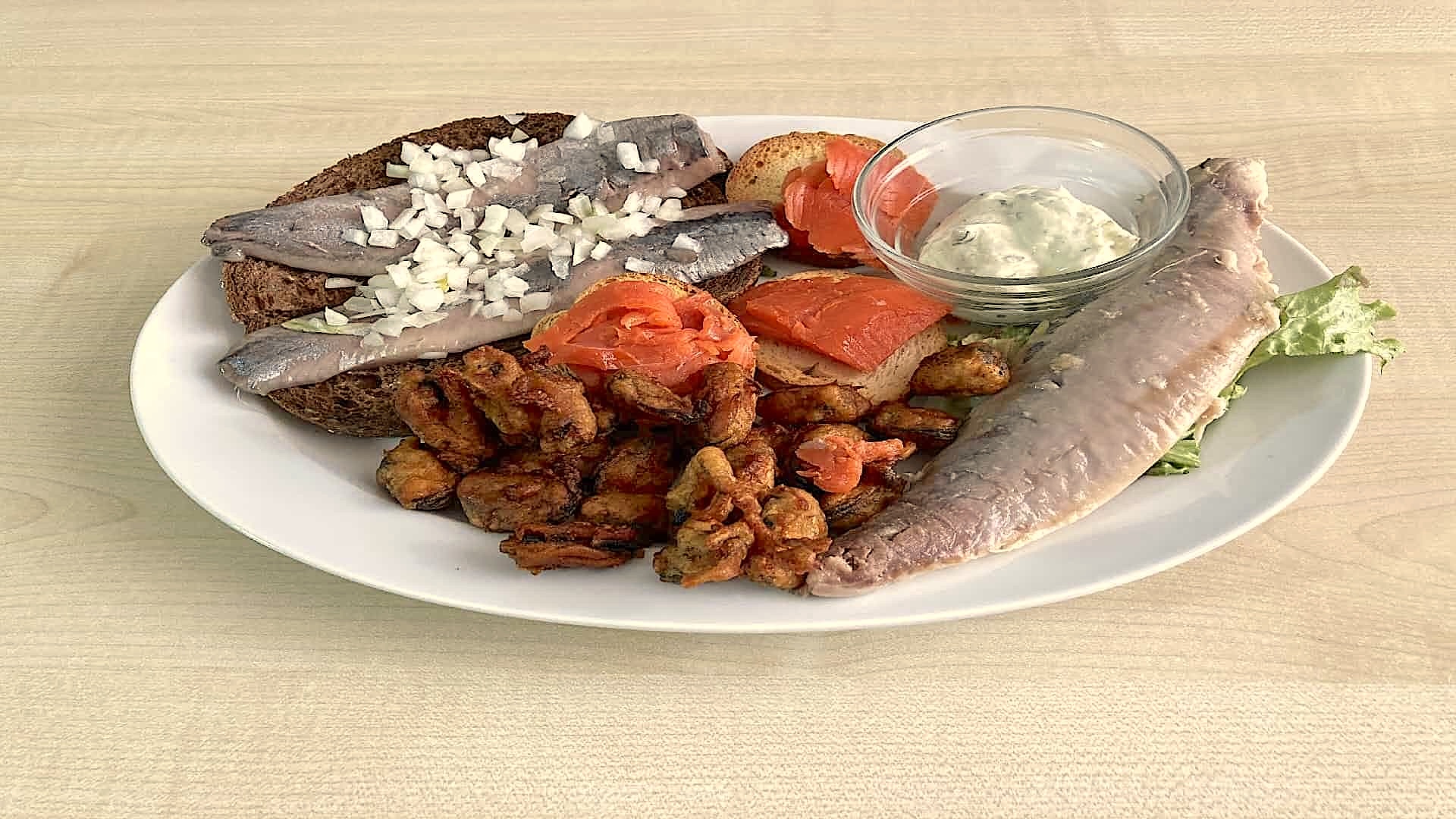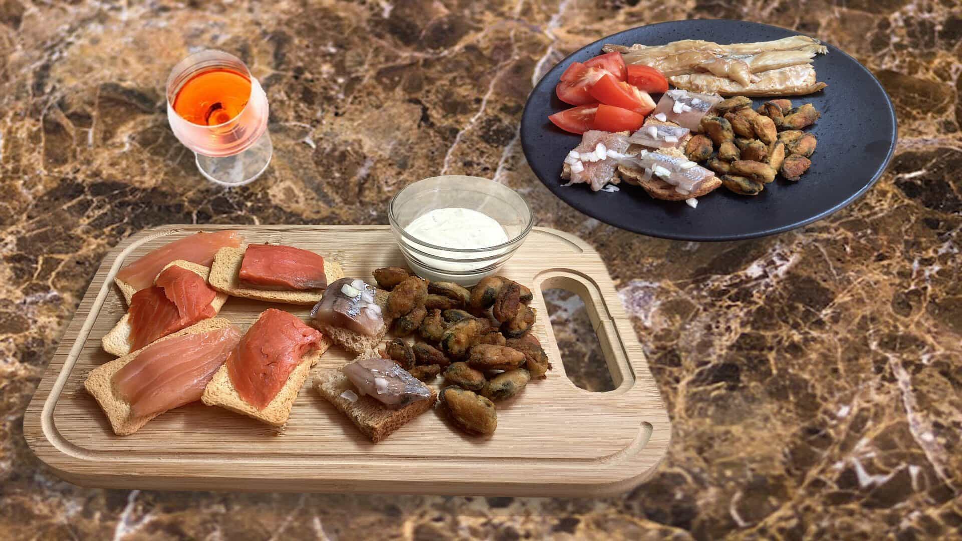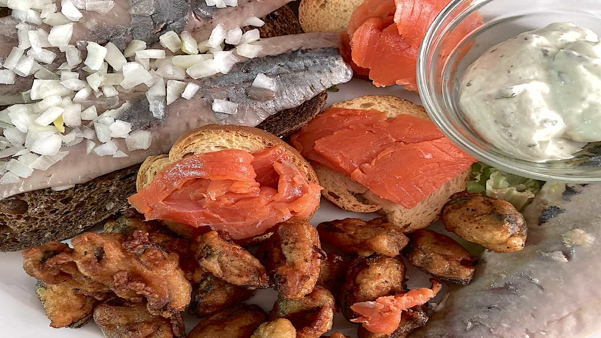 Haal de gerookte makreelfilet en de gerookte zalm pakweg 1/2 uur van te voren uit de koelkast. Op kamertemperatuur zijn deze het lekkerst.