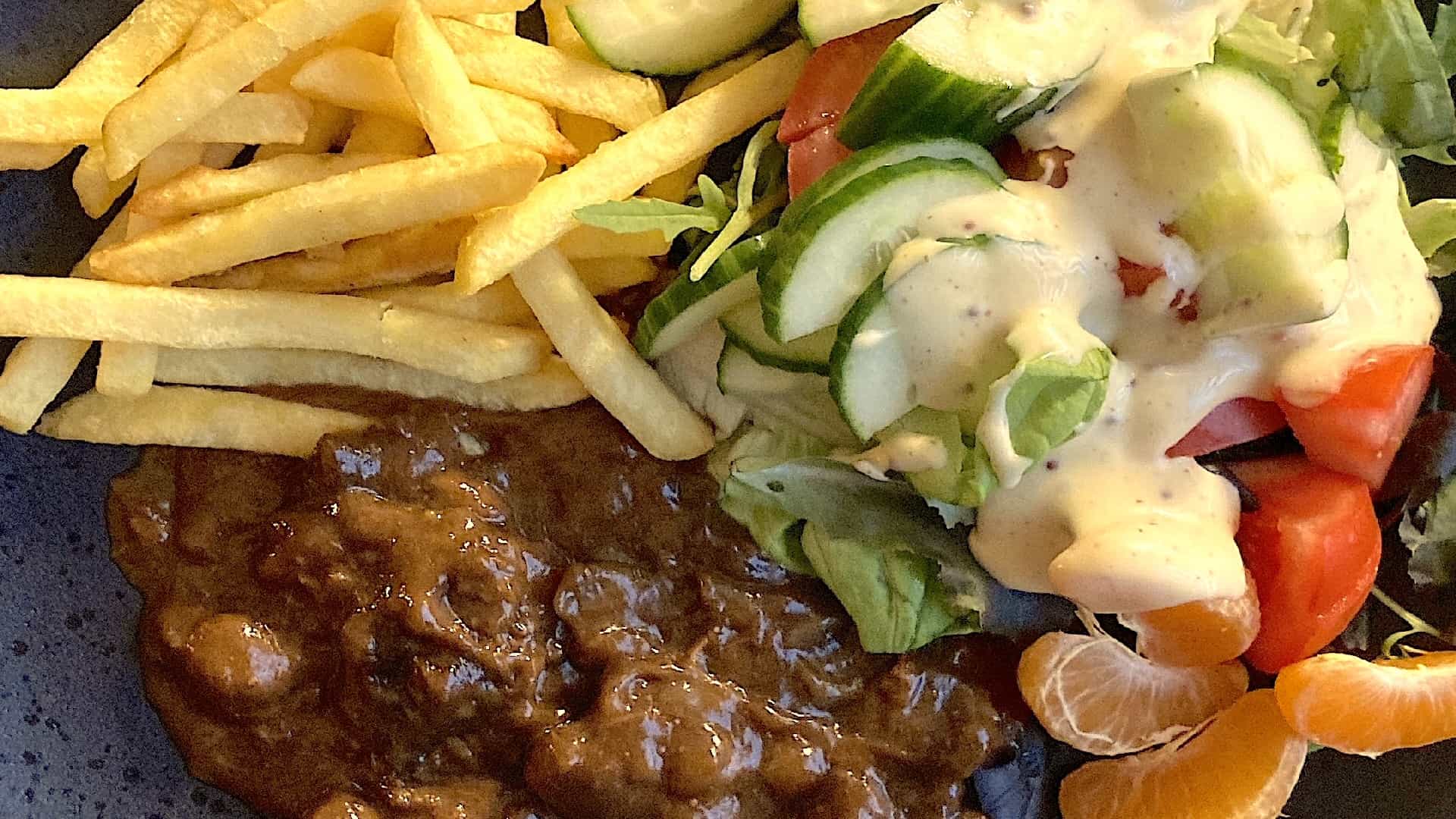 Voor het stoofvlees heb je een oven nodig en voor de patat een magnetron.