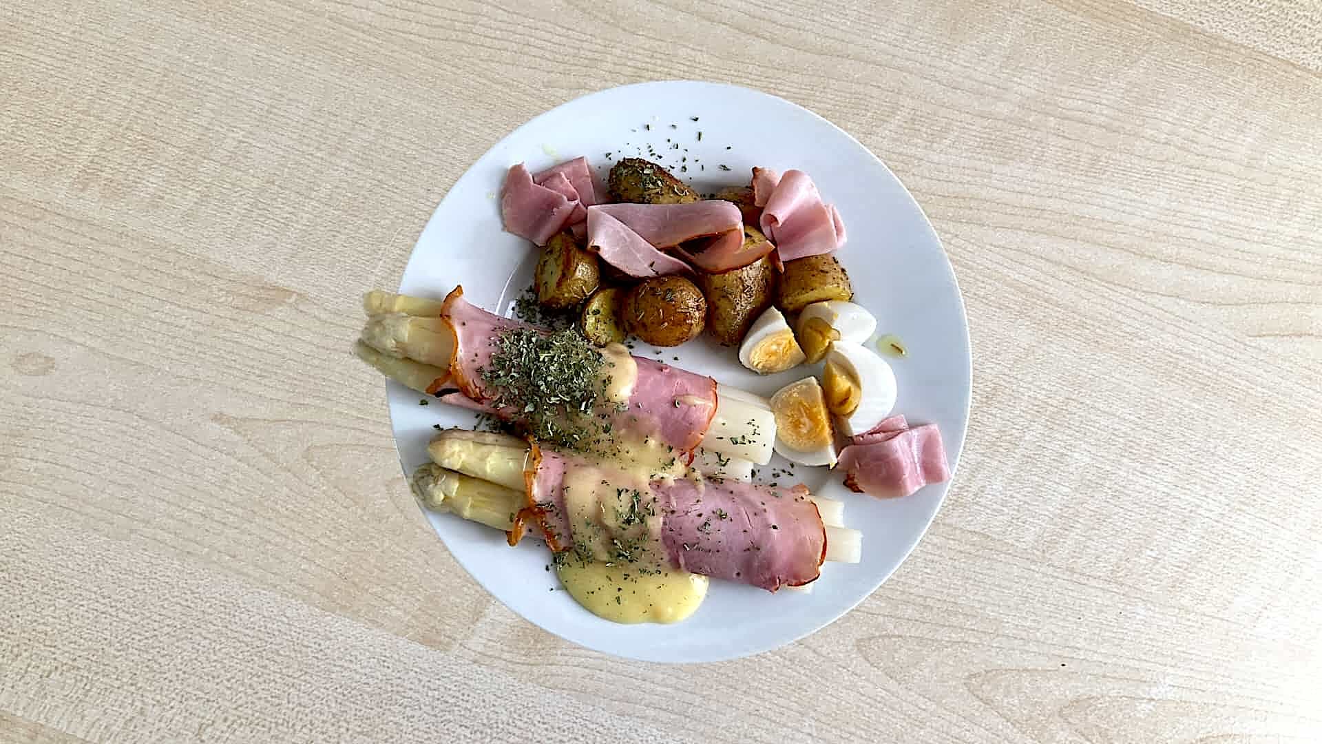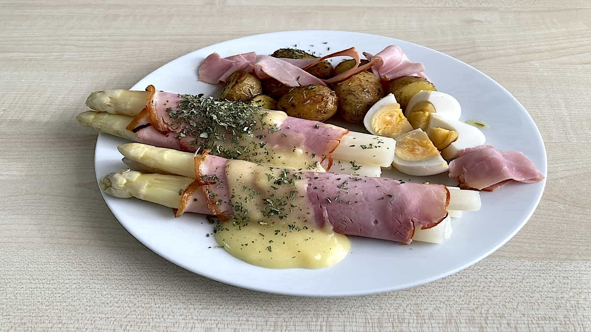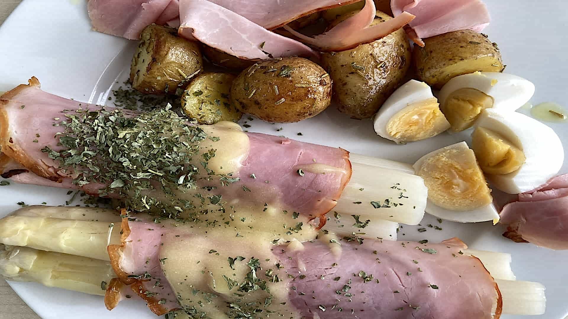 Serveer de asperges en krieltjes op een plat bord en garneer met de reepjes ham, saus, eieren en peterselie.