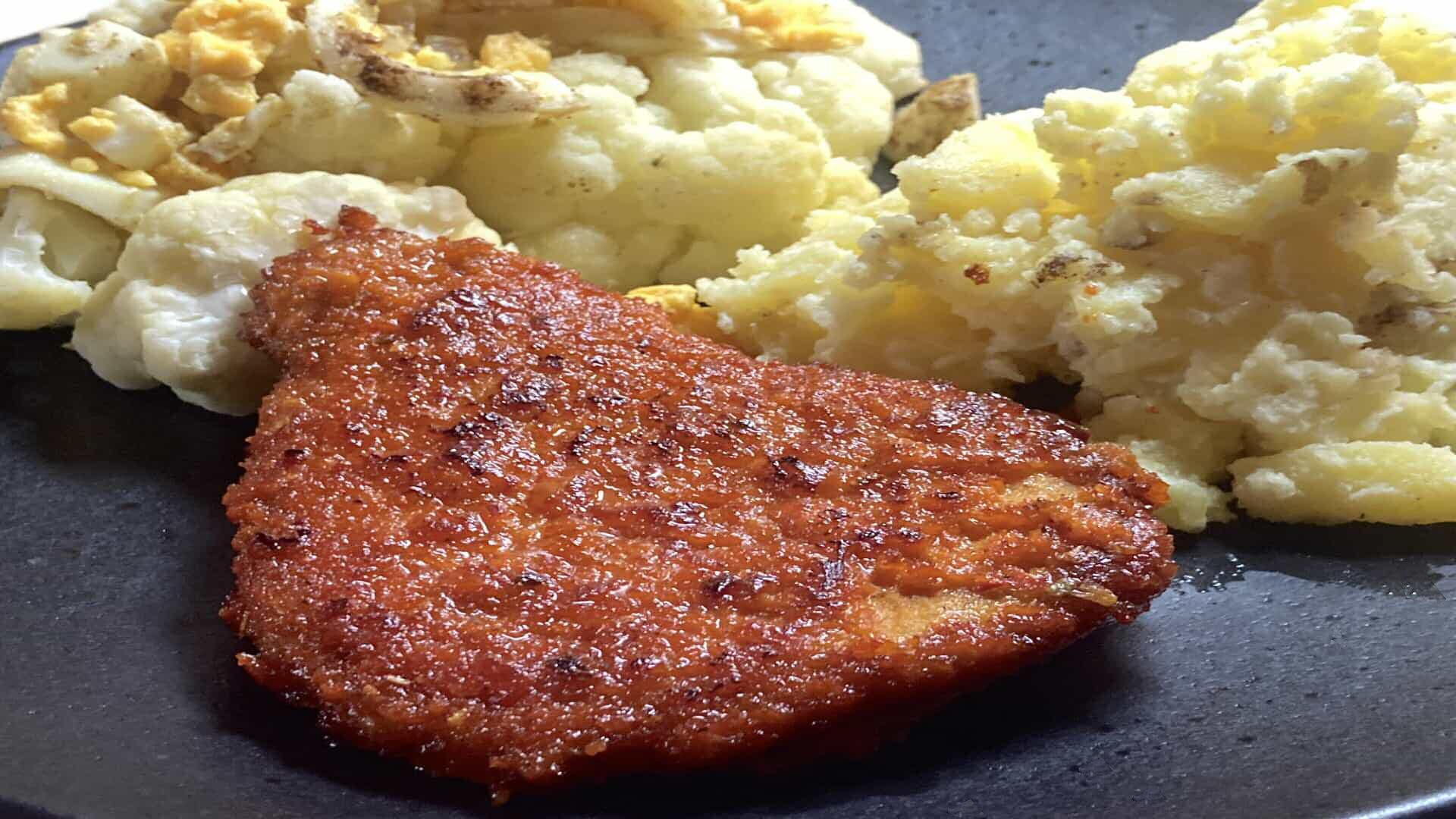 Serveer de bloemkool met puree en schnitzel op een bord. Strooi er nog wat nootmuskaat over