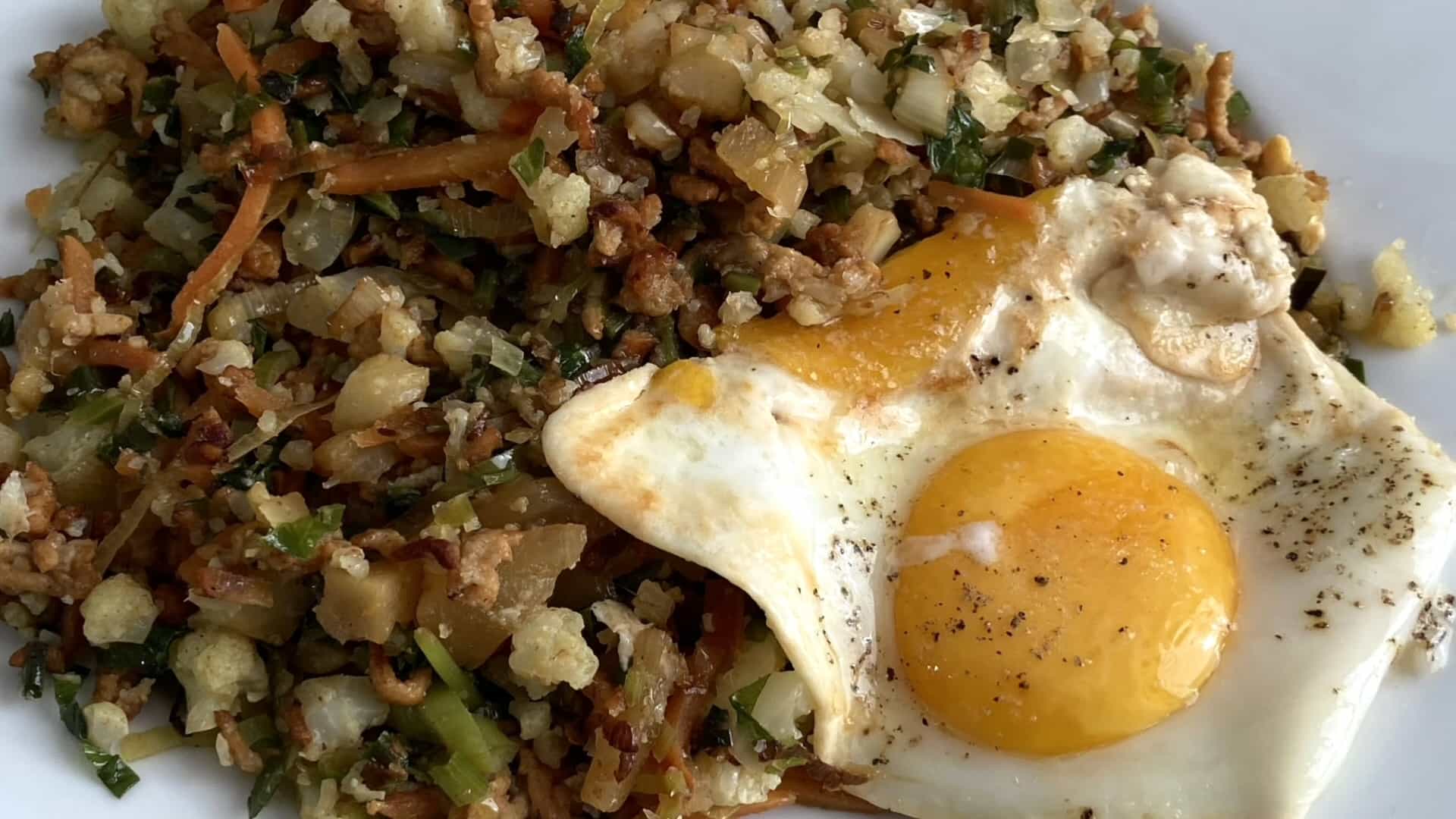 Serveer de nasi van bloemkoolrijst op een plat bord met het spiegelei.