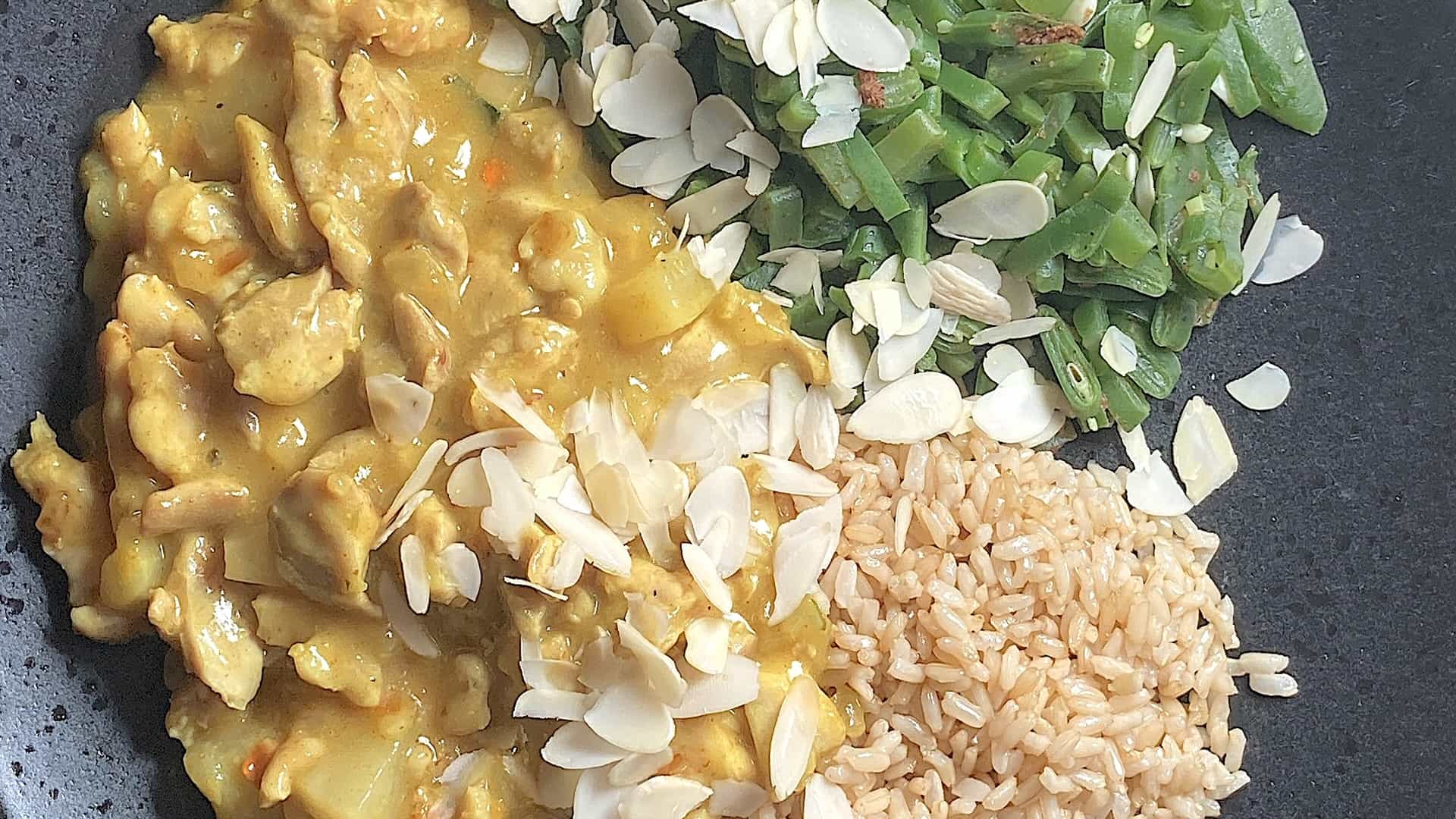 Voor de kip en kerrie heb je een hapjespan nodig. Voor de rijst en amandelen een koekenpan en voor de snijbonen een kookpan.