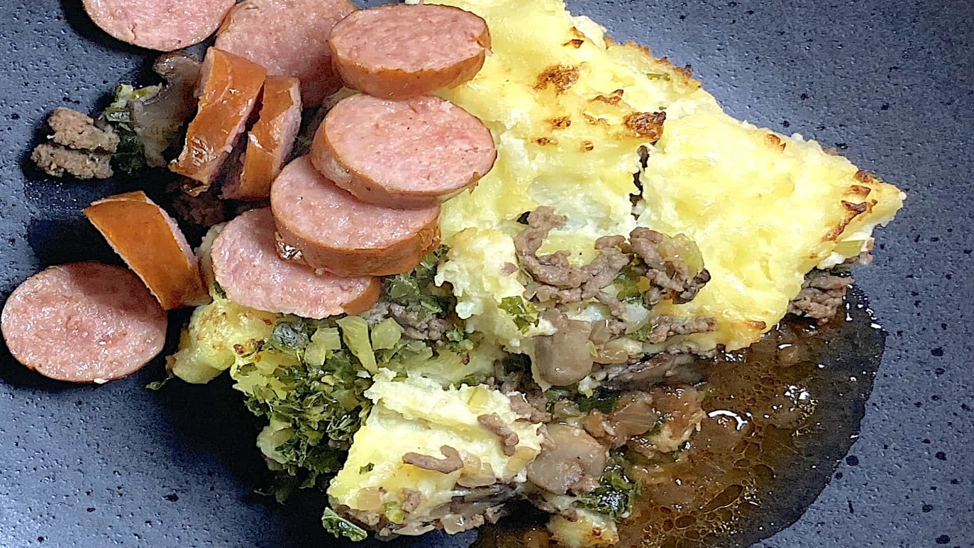 Serveer de ovenschotel op een bord. Eventueel met een rookworst. Zie de foto's