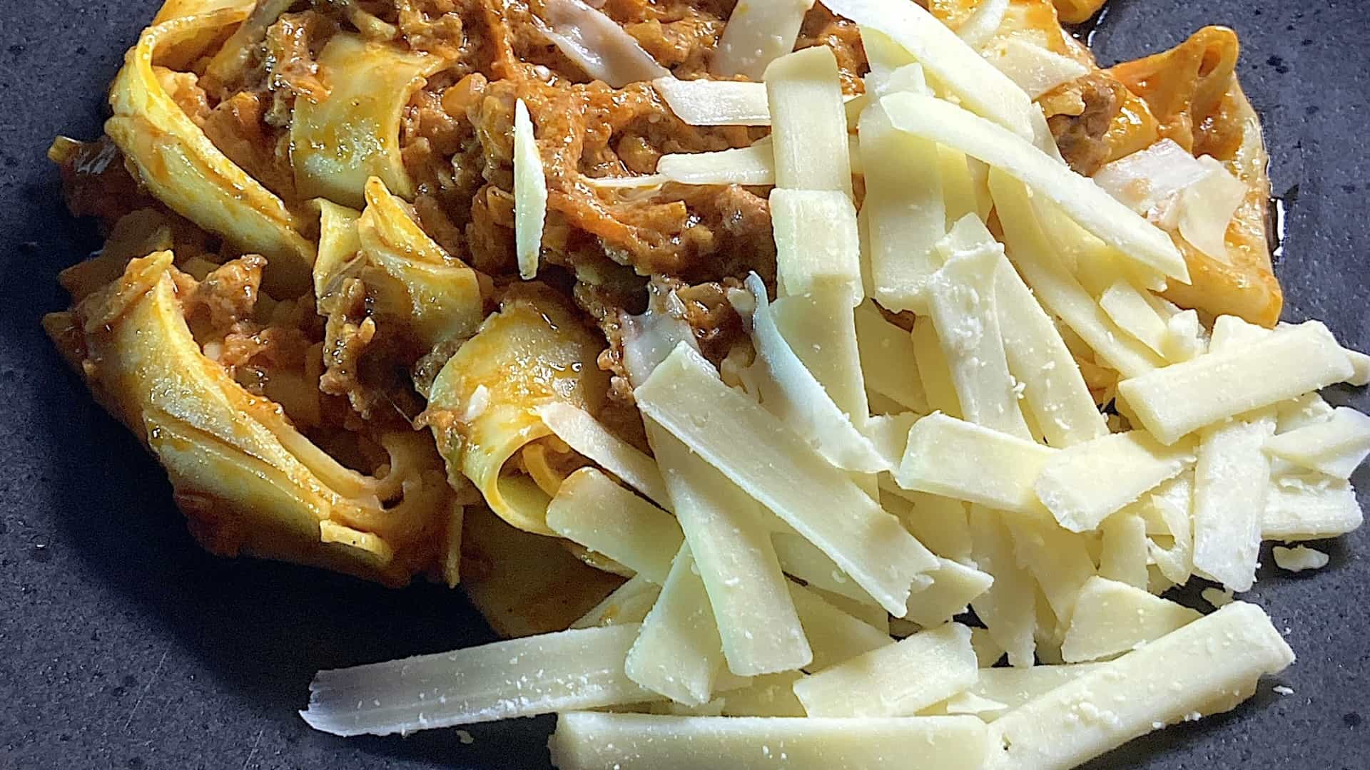 Serveer de pappardelle met bolognesesaus op een bord en strooi er ruimhartig de Parrano snippers over.