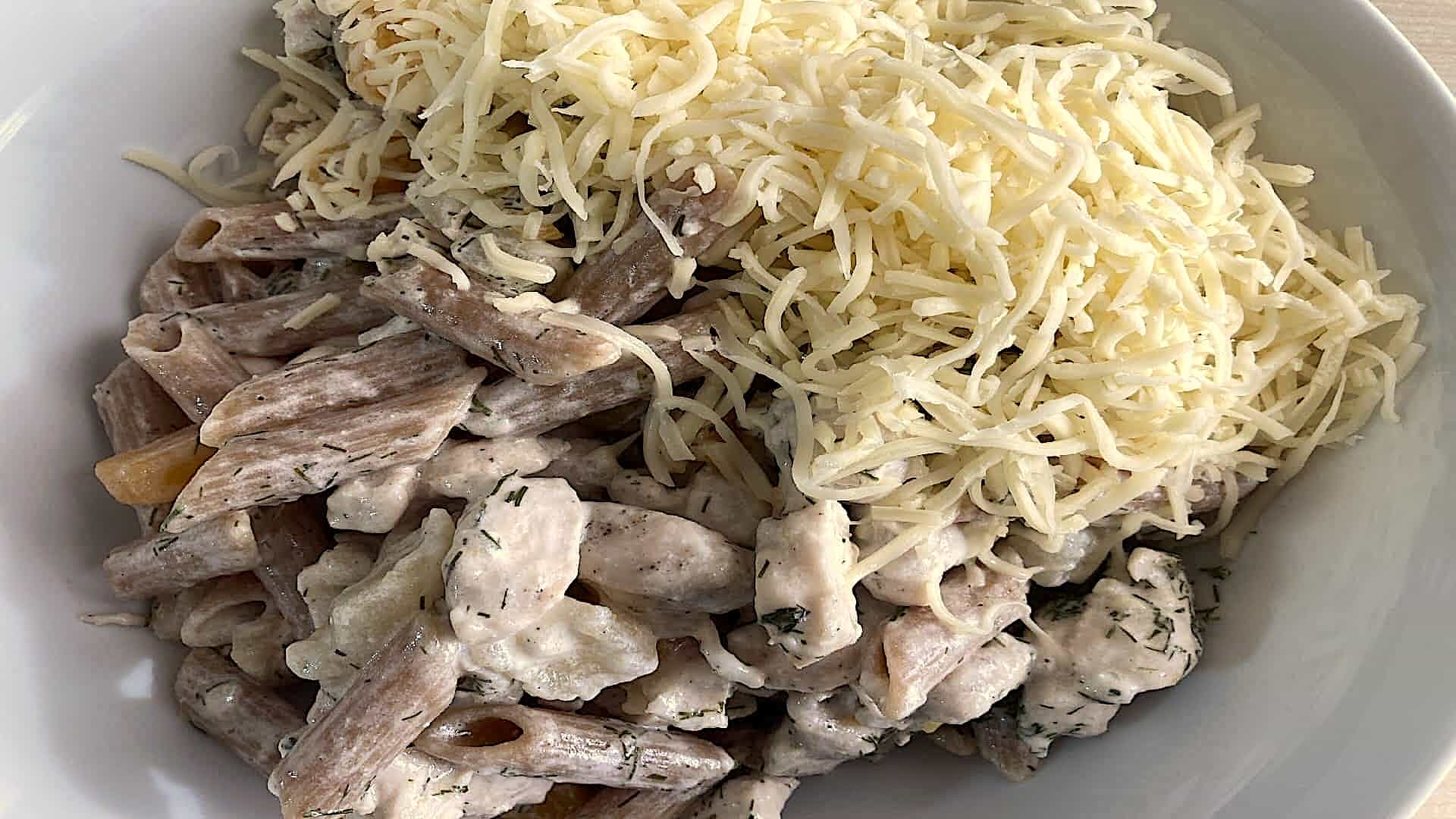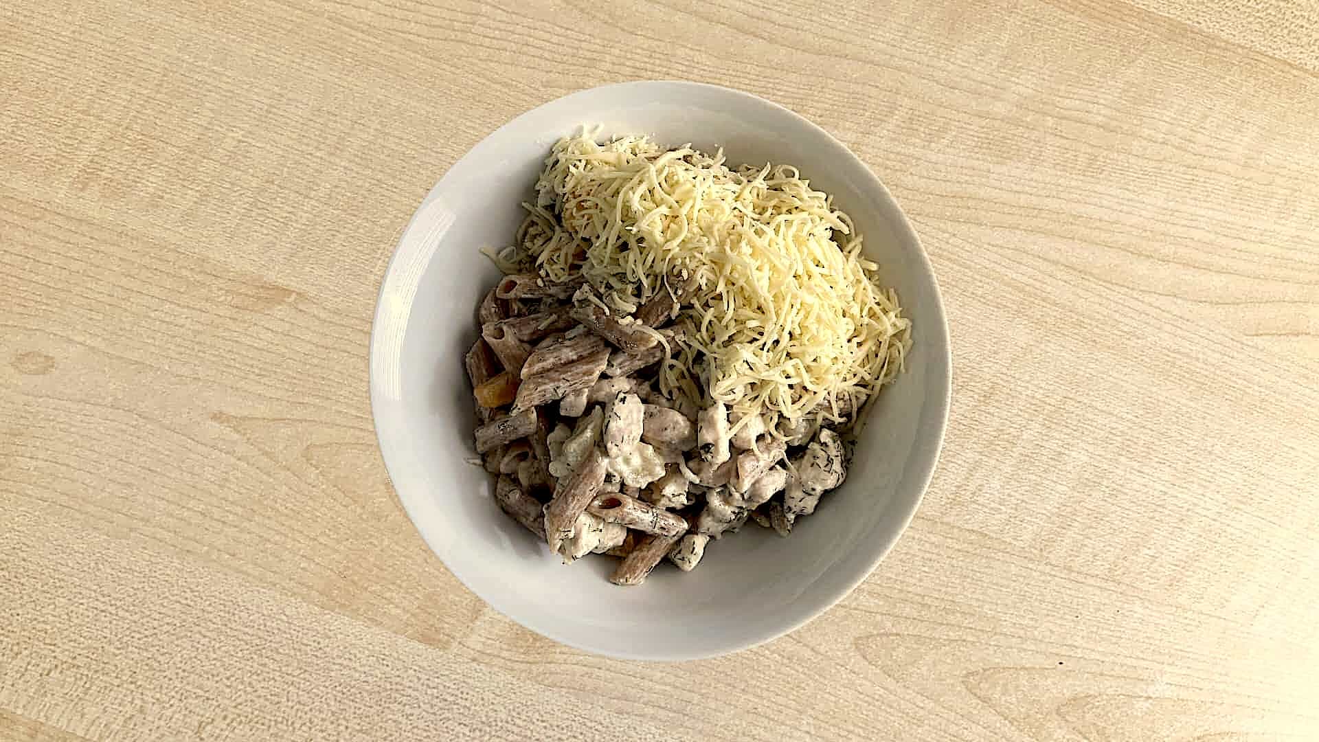 Serveer de penneschotel op een plat bord en strooi er ruimhartig de geraspte kaas over.