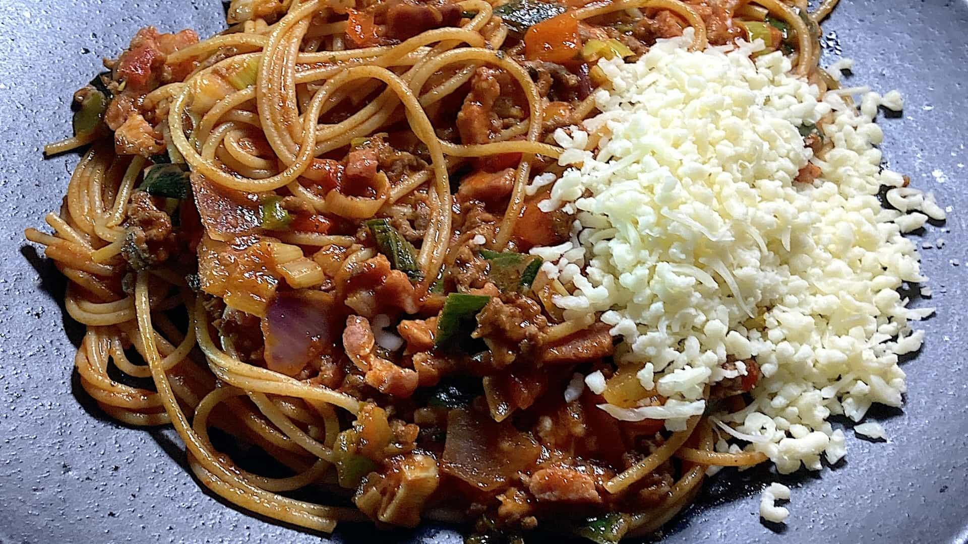 Serveer de spaghetti op een bord en strooi er ruimhartig de overgebleven geraspte kaas bij.
