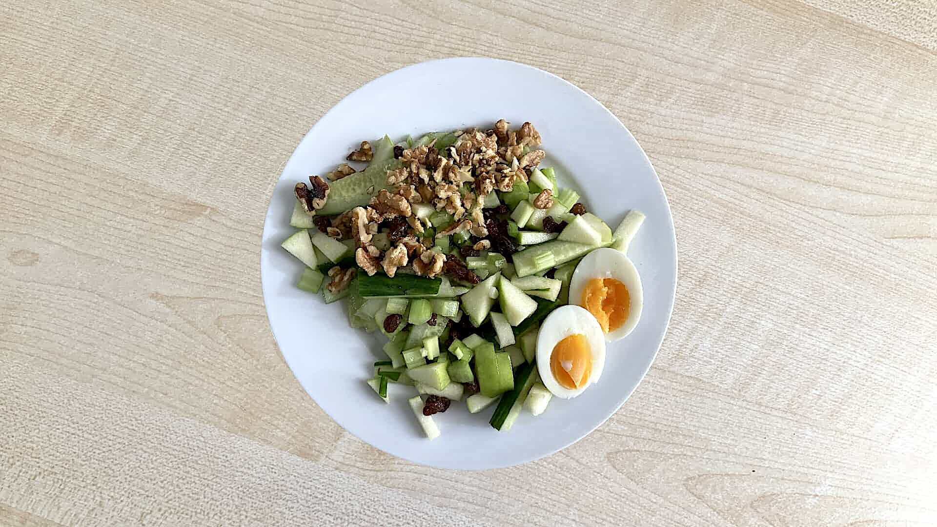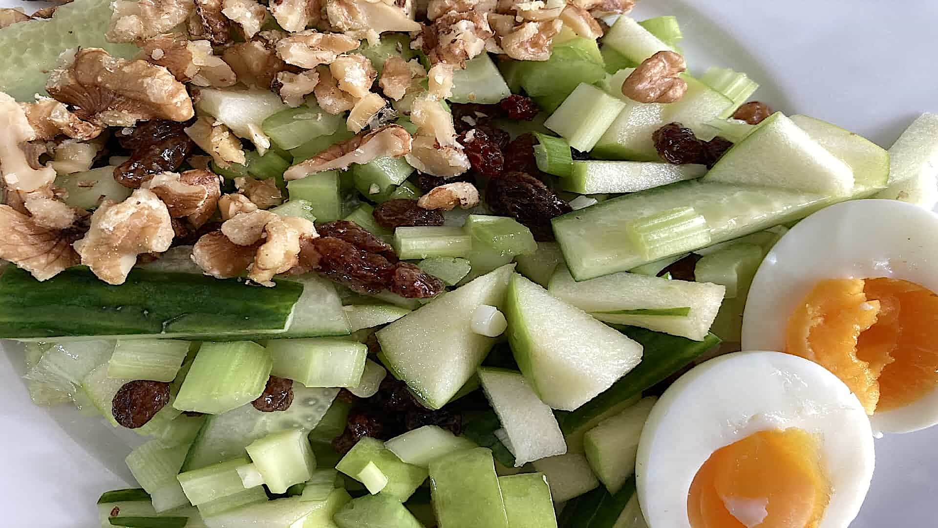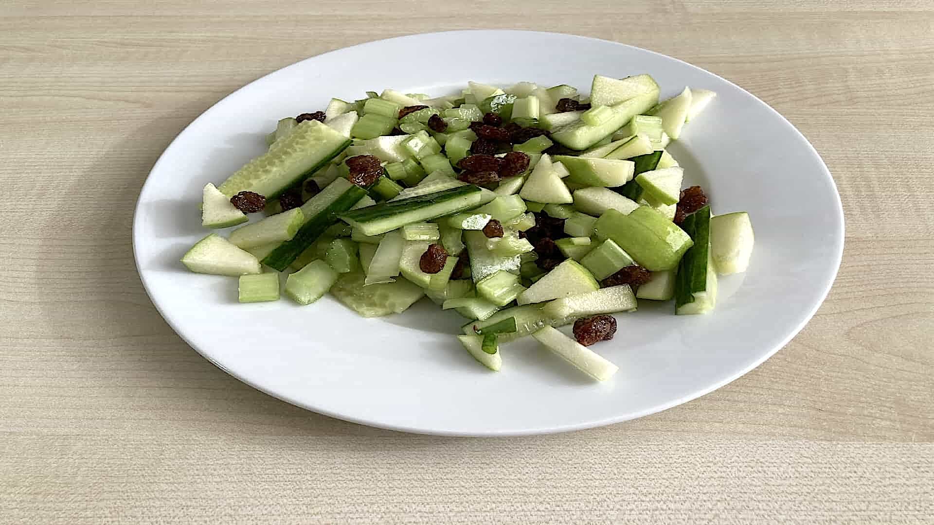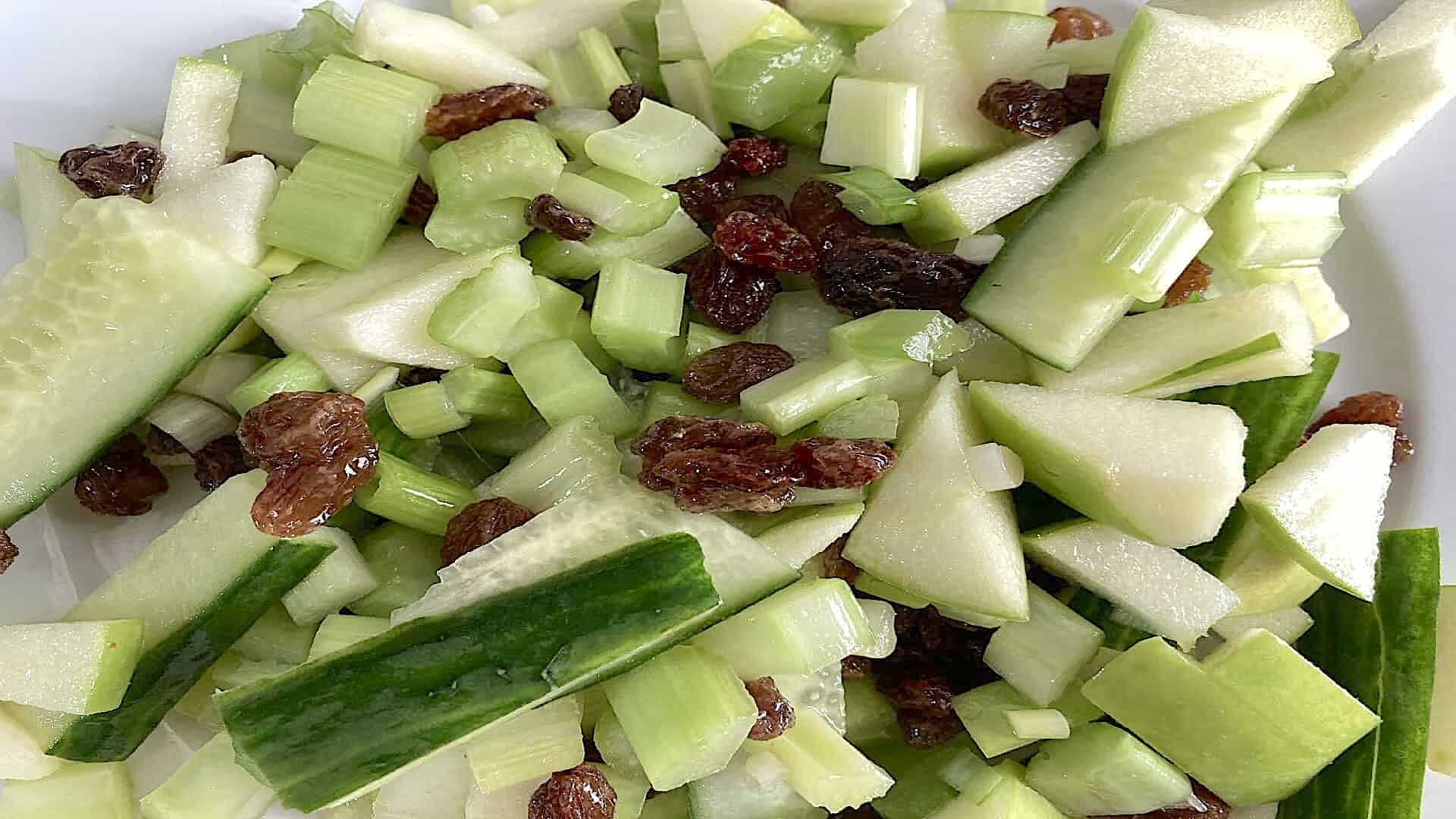 De bleekselderijsalade maak je aan in een hoge mengkom.